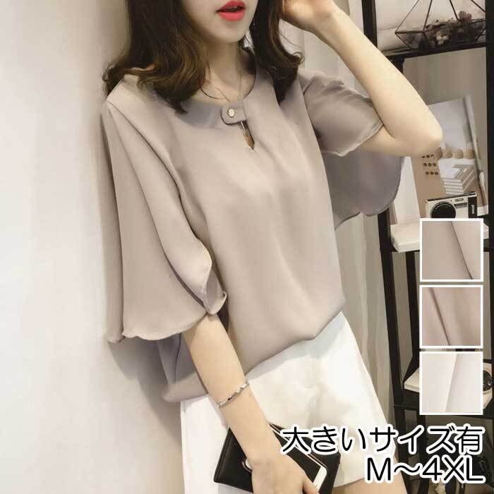 トップス レディース ミドルスリーブ Tシャツ 大きいサイズ クラシカル 涼しい きれいめ カジュアル おしゃれ ブラウス とろみ感 薄手 カットソー シャツ 五分袖 フリルスリーブ 可愛い フェミニン 上品 韓国 ホワイト 白 グレー ピンク 春 夏 秋 20代 30代 40代 50代 半袖 5分袖 五分袖 ラウンドネック 個性的 デート ホテル レストラン 楽ちん こなれ感 ラブリー キュート 個性的 存在感 モテ 体系カバー S M L XL 2XL 3XL 4XL 袖あり ボリューム袖 萌袖
