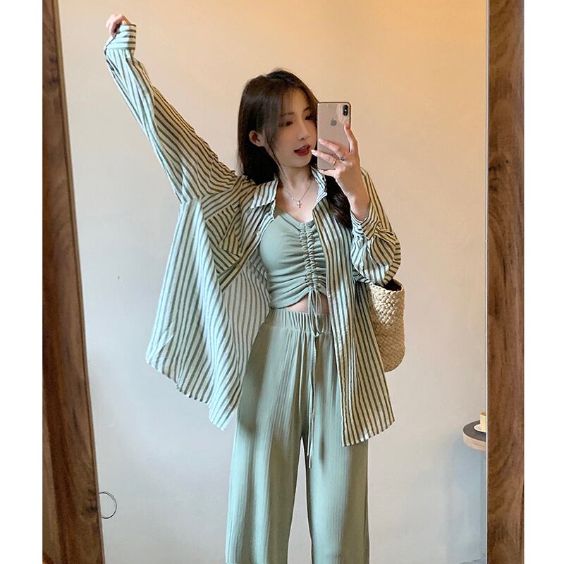 シャーリングデザインがオシャレなリブ素材のキャミソールと、同素材のパンツ、そしてポケットが折り返しデザインになったストライプのブラウスの3点セットです。