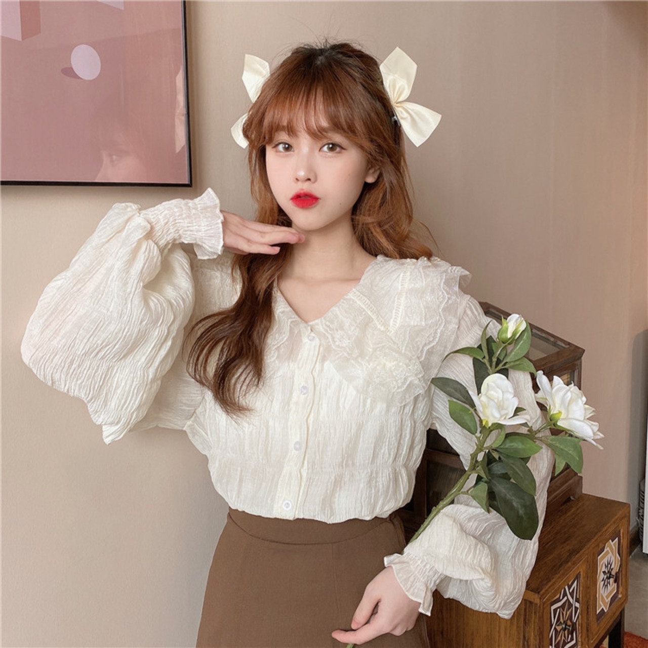 トップス シャツ ブラウス 袖あり 長袖 シワ加工 襟付き フリルカラー レースカラー ゆるふわ ボタン ボリューム袖 バルーンスリーブ 美ライン レース 刺繍 前開き 透け感 かわいい 大人可愛い きれいめ シンプル カジュアル 大人 上品 おしゃれ お洒落 大人可愛い 大人女子 こなれ感 ラフ ラブリー キュート ガーリー 個性的 クール エレガント モダン 主役級 存在感 抜け感 ベーシック ヨーロッパカジュアル スタンダード 洗練 無地 エイジレス レディース お出かけ 旅行 着回し 普段使い