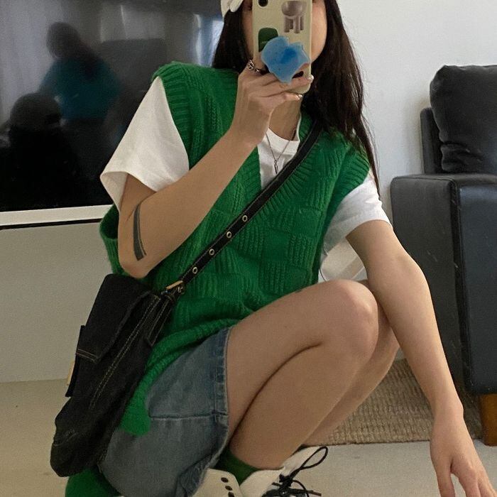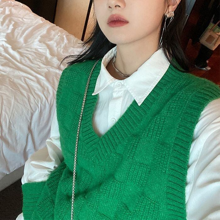 トップス ベスト ノースリーブ Vネック 襟なし デザイン ビッグシルエット 美ライン 伸縮性 カレッジ チェッカー かわいい 大人可愛い きれいめ シンプル カジュアル 大人 上品 おしゃれ お洒落 レトロ 大人可愛い 大人女子 こなれ感 ラフ ラブリー キュート ガーリー クール モダン 主役級 存在感 抜け感 ベーシック ナチュラル ヨーロッパカジュアル スタンダード 洗練 アメカジ 無地 エイジレス レディース お出かけ 旅行 着回し 普段使い 重ね着 お揃い ファッション フリーサイズ グリーン