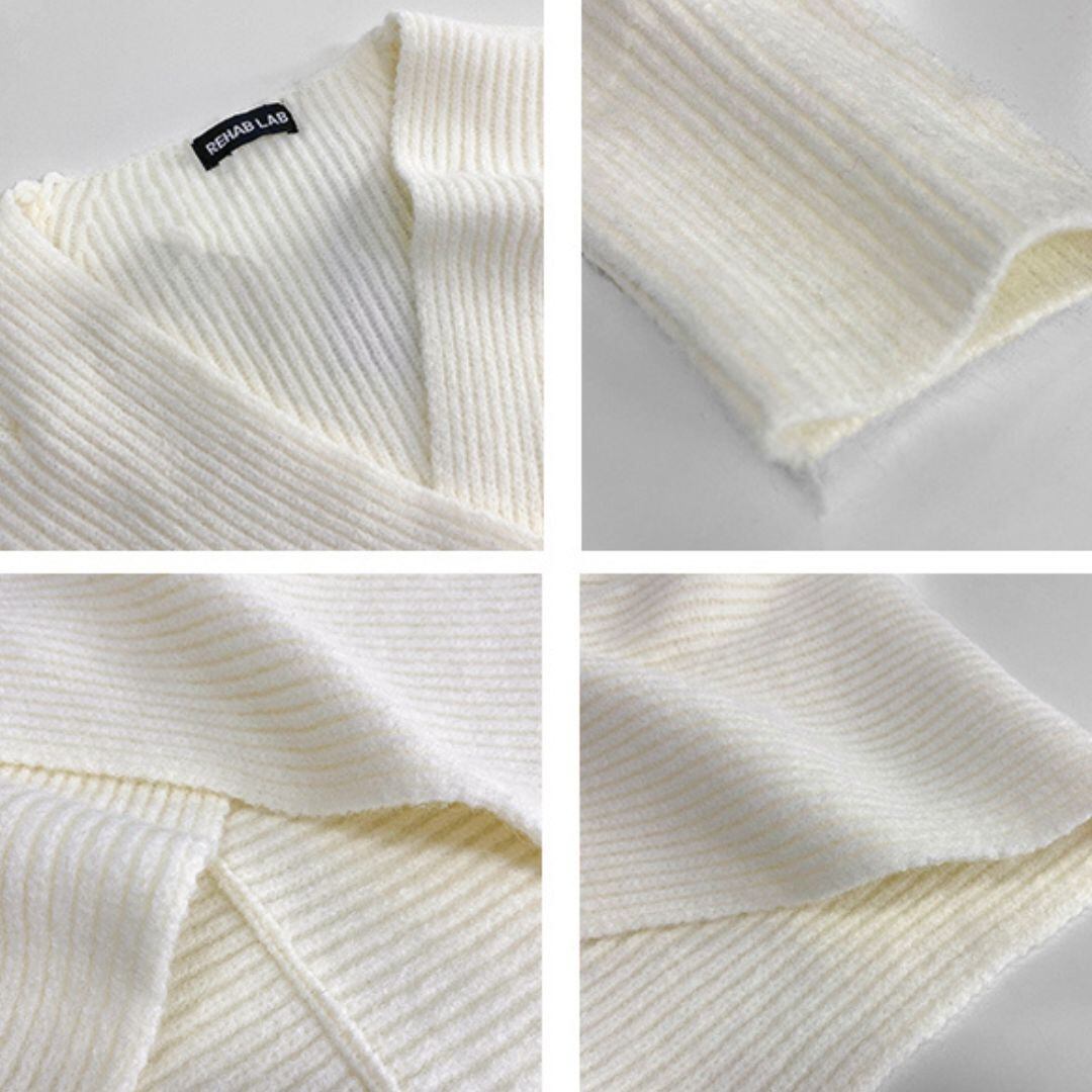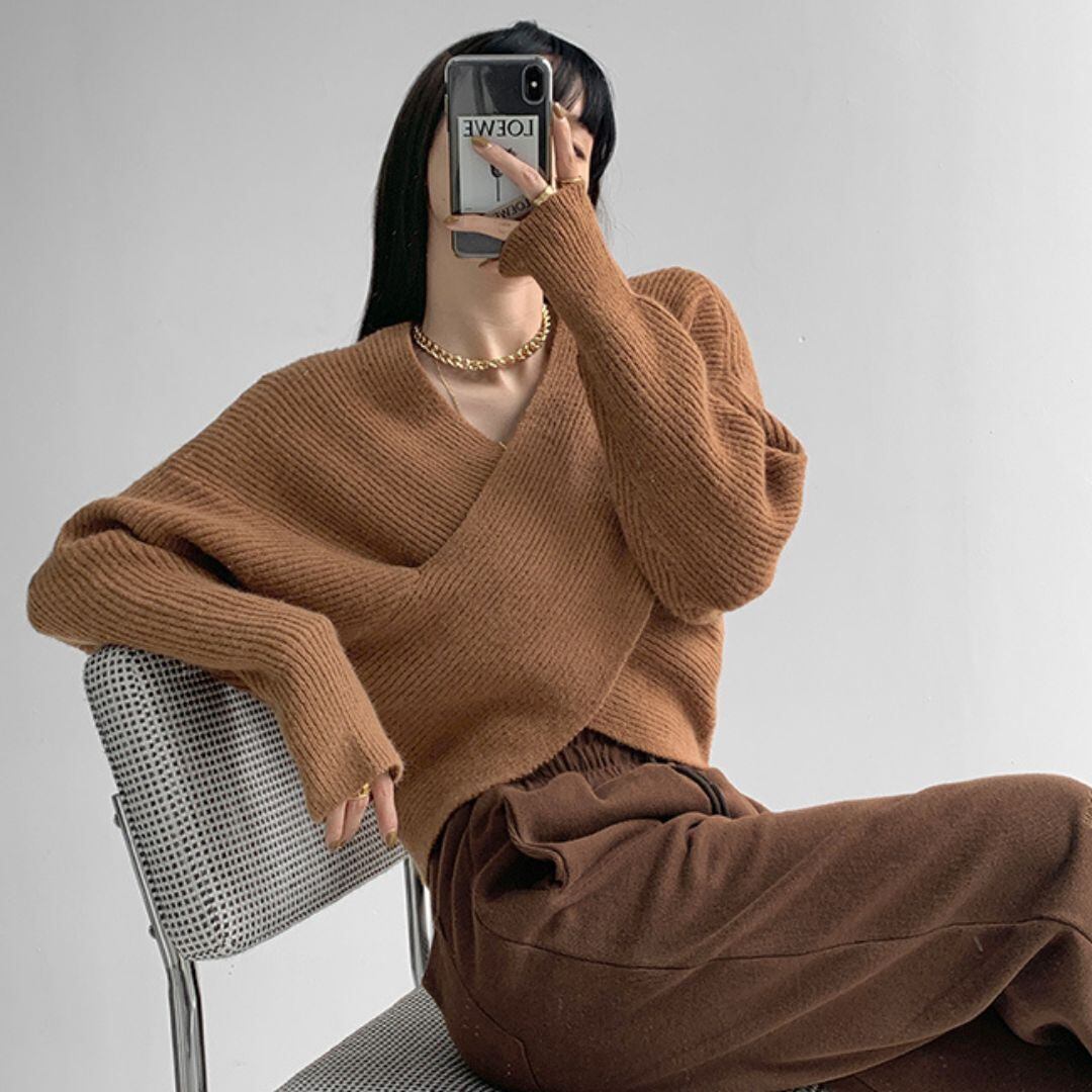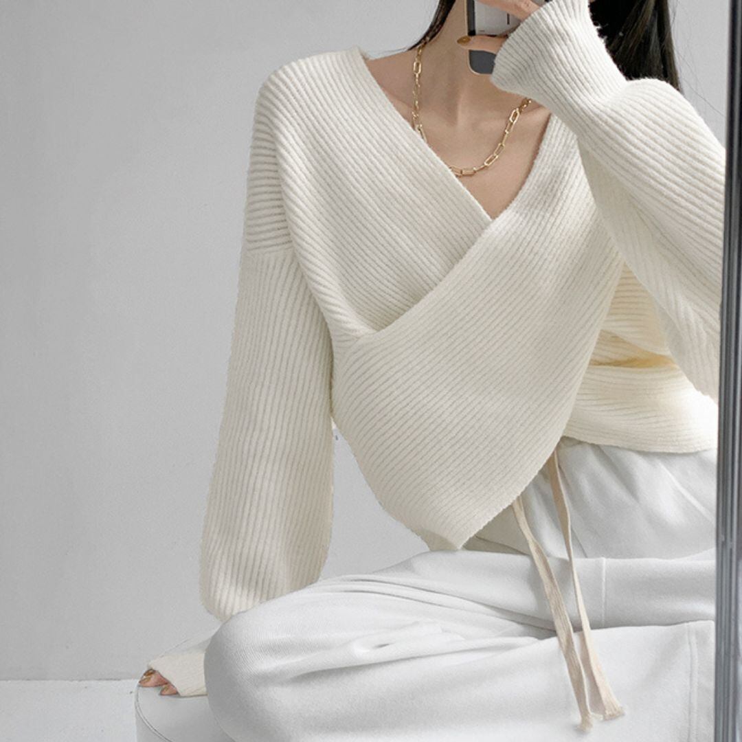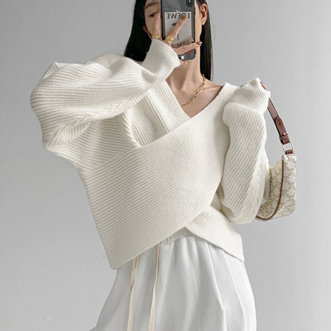 トップス カットソー ニットソー セーター 袖あり 長袖 ボリューム袖 萌袖 Vネック クロスデザイン リブ リブニット シンプル カジュアル 大人 おしゃれ お洒落 かっこいい 大人女子 こなれ感 ラフ 個性的 クール 抜け感 無地 ストライプ 秋 冬 10代 20代 30代 40代 50代 60代 レディース 女性用 ママ 学生 通学 デート お出かけ 女子会 イベント 旅行 着回し 普段使い お揃い 双子 韓国 オルチャン ファッション コーデ サイズ S M L 灰色 グレー 白 ホワイト 茶色