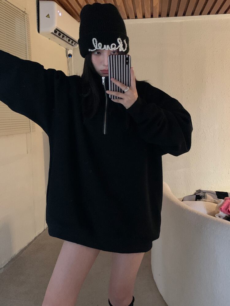 ハーフジッパー シンプル トップス プルオーバー トレーナー 袖あり 長袖 ボリューム袖 襟付き ジッパー ワイド ファスナー ふんわり ゆったり シンプル カジュアル かっこいい レトロ こなれ感 ラフ メンズライク マニッシュ ボーイッシュ スポーティー ラブリー キュート ガーリー ルーズ 抜け感 無地 春 秋 10代 20代 30代 レディース 女性用 男女兼用 OL 学生 休日 運動 若見え フリーサイズ ワンサイズ 黒 ブラック 茶色 ブラウン 灰色 グレー 水色 ネイビー 紺色 ライトブルー