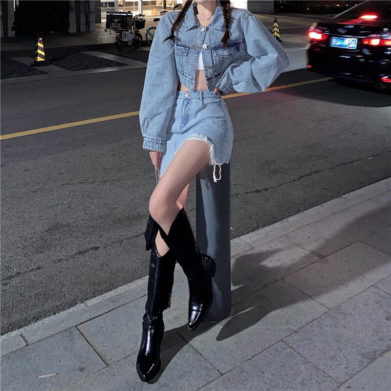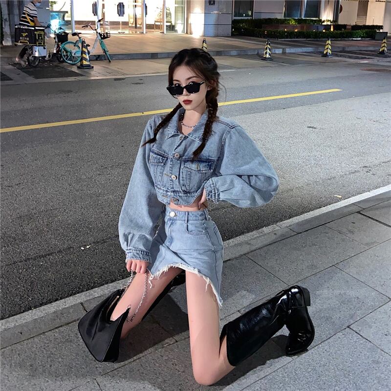 スカート ボトムス アウター 上下別売り セットアップ ジャケット デニムジャケット デニムスカート Gジャン 上着 ミニ丈 ショート丈 袖あり 長袖 襟付き タイト 細身 ハイウエスト おしゃれ お洒落 かっこいい こなれ感 ラフ 個性的 クール 抜け感 無地 10代 20代 レディース 女性用 ママ 女の子 学生 通学 デート お出かけ 女子会 イベント 旅行 着回し 普段使い 韓国 オルチャン ファッション コーデ ダメージ 穴あき 切りっぱなし サイズ S M L 小さいサイズ 青 ブルー
