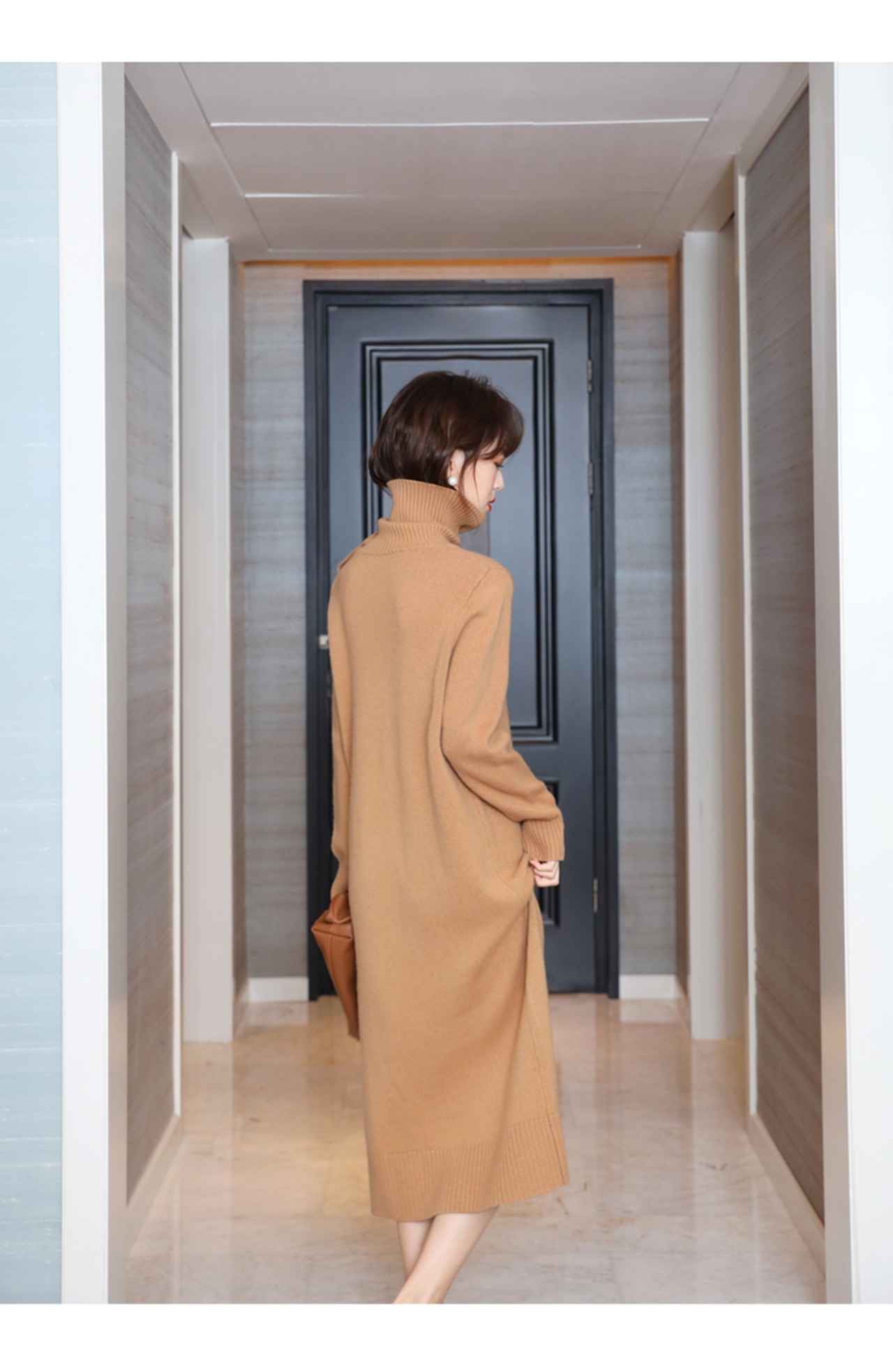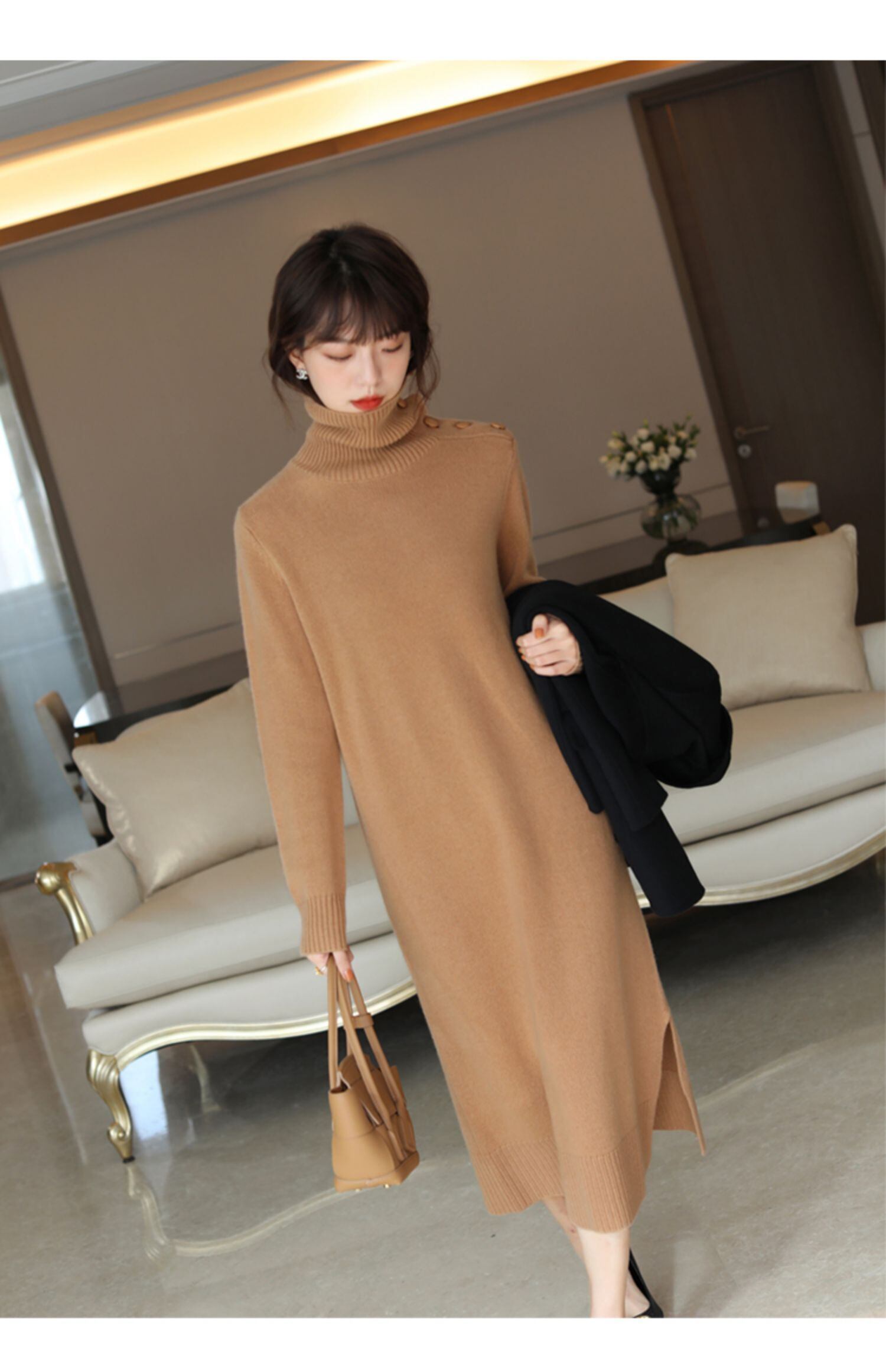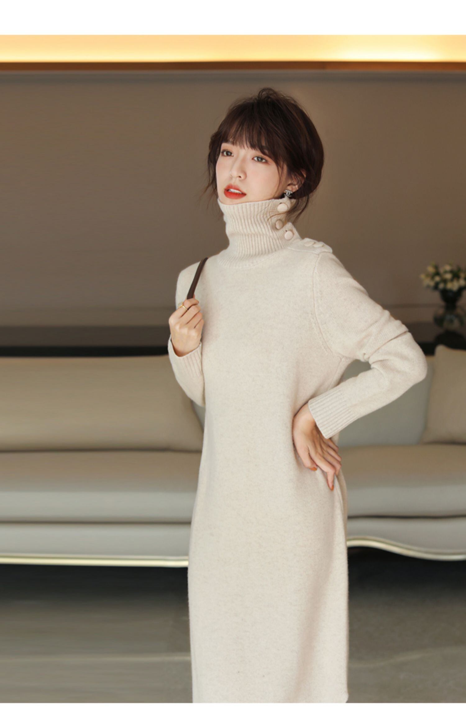 襟のボタン使いがポイントのタートルネックニットワンピースです。