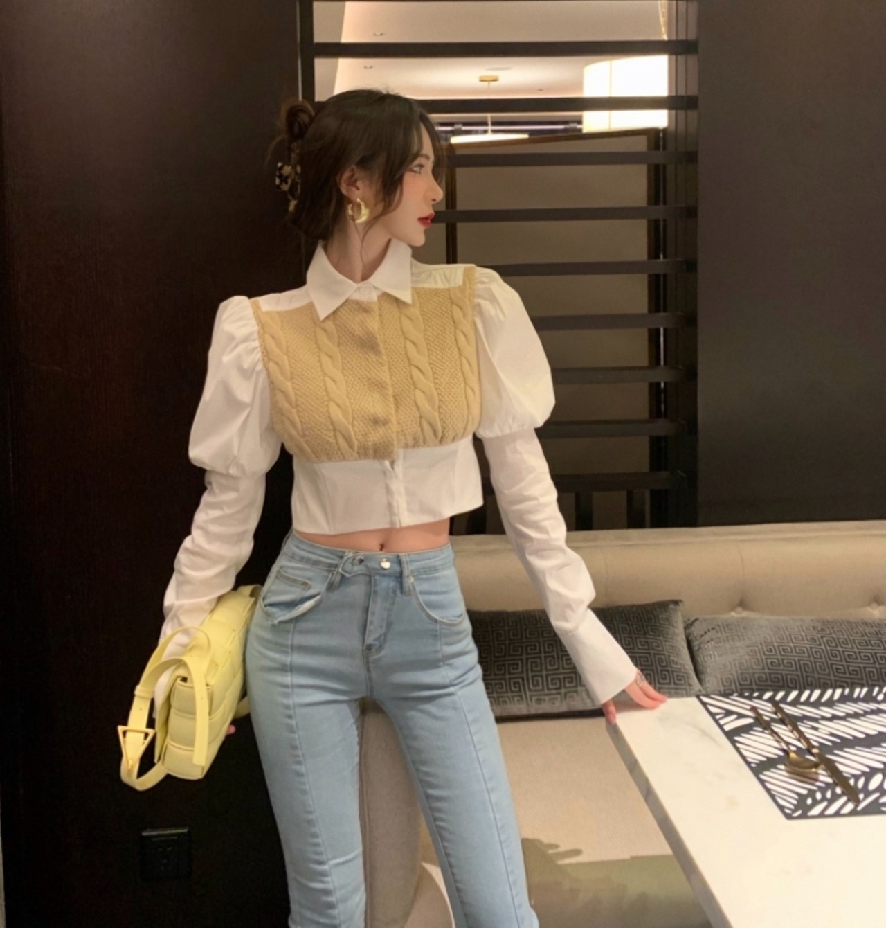 ショート丈の白シャツにニット素材の切り替えがついたトップスです。ベージュの落ち着いた色合いが大人の魅力を引き立ててます。