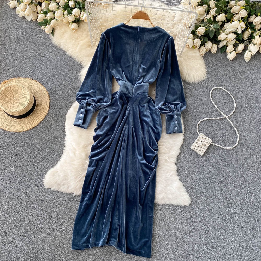 ワンピース ワンピドレス ミモレ丈 ロング丈 袖あり 長袖 Vネック カシュクール ストレート ベルベット かわいい 大人可愛い きれいめ シンプル 大人 上品 おしゃれ かっこいい レトロ 大人女子 こなれ感 クール セクシー エレガント 主役級 存在感 フォーマル 無地 秋 冬 誕生日 謝恩会 二次会 母の日 バレンタイン 10代 20代 30代 40代 50代 60代 レディース ママ OL 通勤 デート お出かけ 女子会 休日 旅行 ホテル レストラン モテ 体系カバー S M L XL ブルー