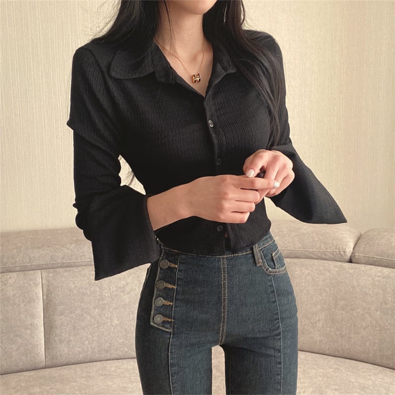 ラペルカラー ホーンスリーブ ギャザー エレガント セクシー ショート丈 へそ出し スリムフィット トップス デート シャツ ブラウス 白シャツ 白トップス ショート 袖あり 長袖 ボリューム袖 萌袖 Vネック 襟付き スリム 前開き シースルー ボタン 薄手 きれいめ カジュアル おしゃれ お洒落 かっこいい レトロ 大人女子 こなれ感 個性的 クール 抜け感 無地 春 秋 10代 20代 30代 レディース 女性用 OL 学生 お出かけ 女子会 休日 モテ S M L 白 ホワイト 黒 ブラック
