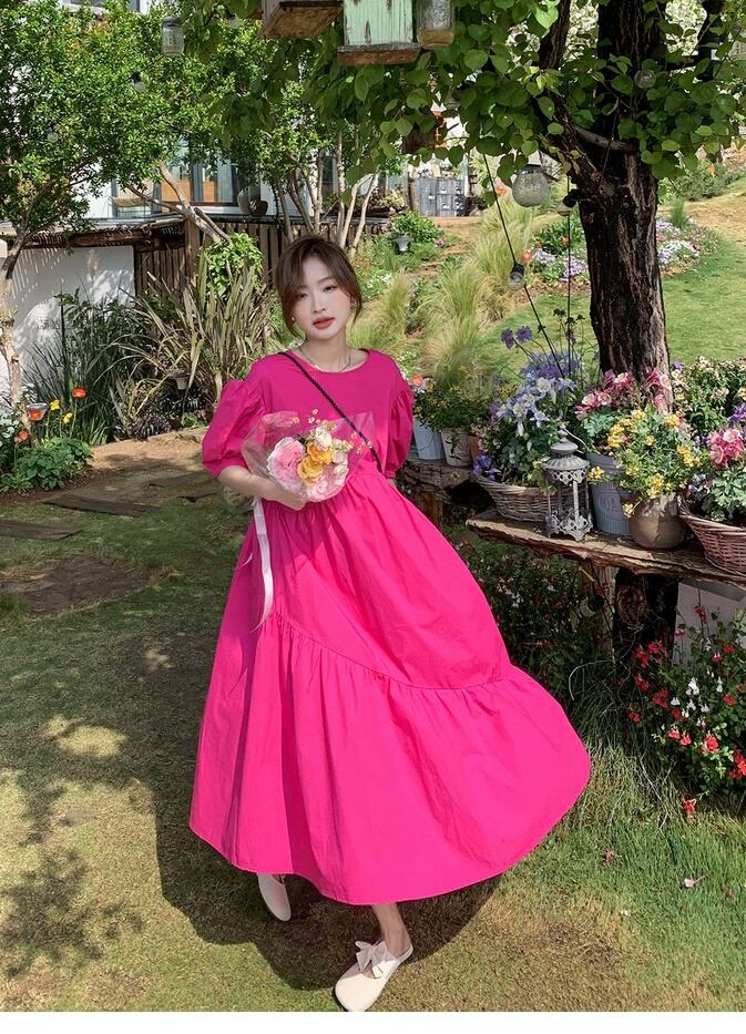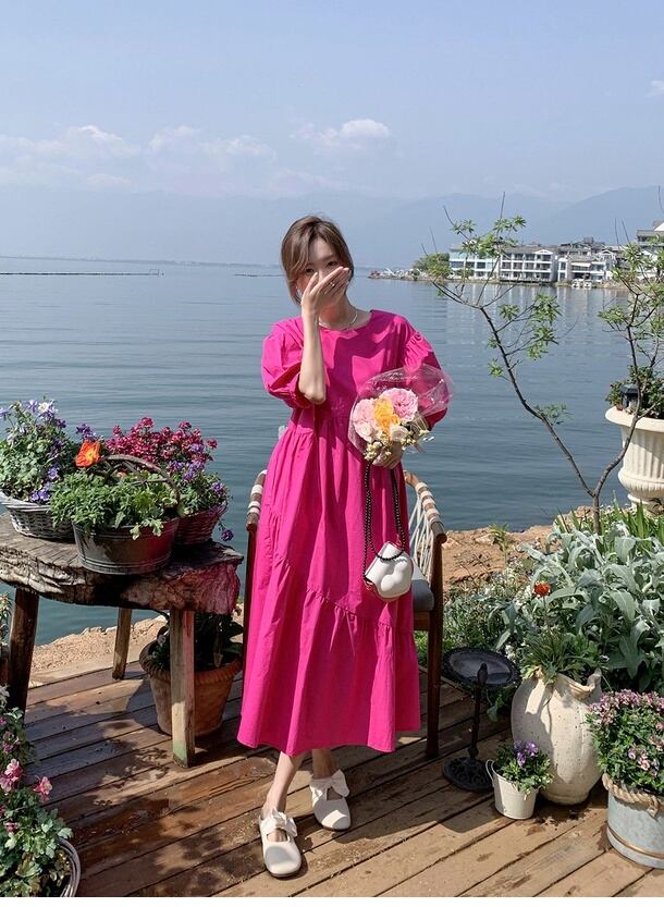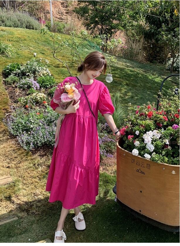 ワンピース ティアードワンピース ワンピドレス ロング ロング丈 5分袖 五分袖 ボリューム袖 Uネック ワイド Aライン 切り替えデザイン ギャザー ティアード かわいい 大人可愛い カジュアル 大人 おしゃれ お洒落 レトロ エスニック エキゾチック 大人女子 こなれ感 ラフ キュート ガーリー ルーズ モード系 モダン 抜け感 S M L XL ゆったり ゆる ピンク 無地 春 夏 レディース お出かけ アウトドア イベント リゾート 旅行 海 プール 韓国系 楽ちん 体型カバー インスタ映え