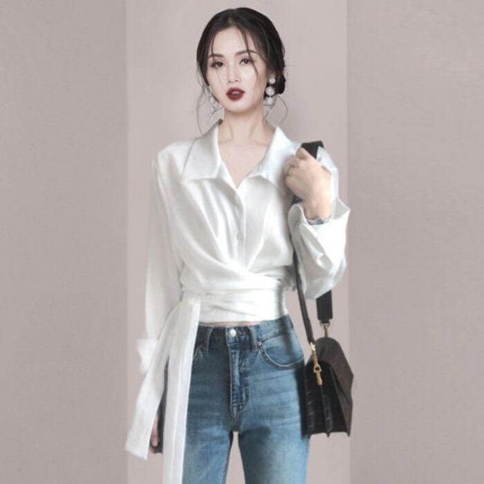 トップス シャツ ブラウス 白シャツ 白トップス ショート ショート丈 半端丈 長袖 襟付き スリム リボン ウエストマーク 前開き ボタン 大人可愛い きれいめ シンプル 大人 上品 おしゃれ お洒落 かっこいい スタイリッシュ 大人女子 こなれ感 個性的 クール モード系 エレガント モダン S M L XL 白 ホワイト 青 ブルー 大人カラー 無地 春 秋 レディース オフィス ビジネス OL 通勤 デート お出かけ イベント 着回し 韓国 韓国系 オルチャン コーデ スタイル モテ 定番