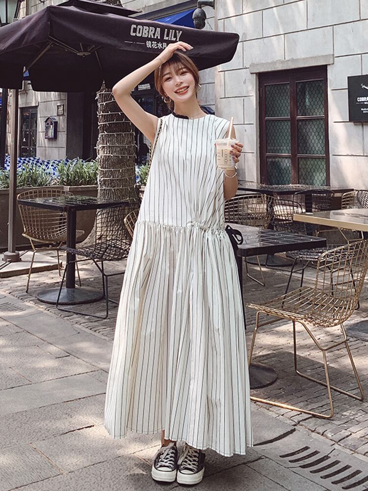 スカート ロングスカート フレアスカート フレアワンピース ロング ロング丈 袖なし ノースリーブ ラウンドネック フレア セミフレア ウエストゴム バックボタン 綿 ポリエステル かわいい 大人可愛い きれいめ カジュアル おしゃれ お洒落 レトロ 大人可愛い 大人女子 こなれ感 ラフ ラブリー キュート ガーリー ルーズ 主役級 存在感 フェミニン ストライプ 春 夏 10代 20代 レディース 女性用 オフィス ビジネス OL 通勤 学生 通学 デート S M L XL プラスサイズ 白 ホワイト
