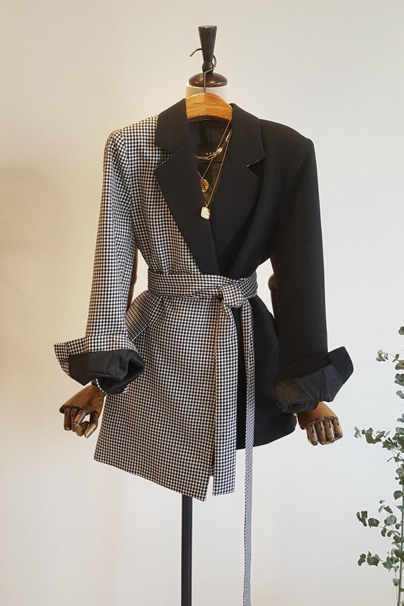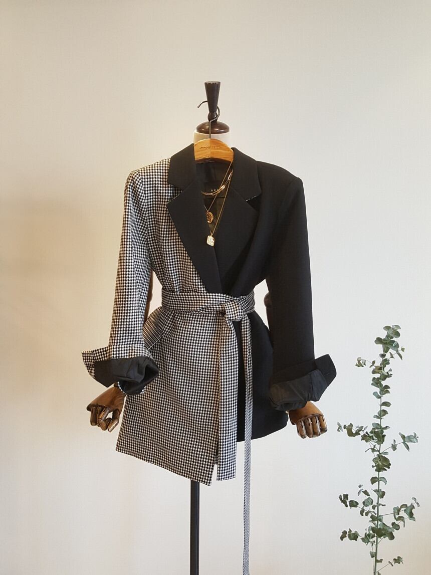 格子柄の切り替えデザインが個性的なジャケットです。アシメントリースタイルがポイント。ベルトでさまざまなアレンジを楽しむことができます。