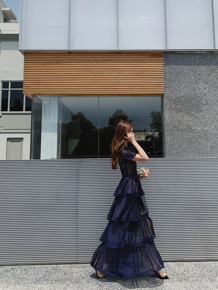 レース素材の段フリルデザインが個性的で華やかな印象のロング丈ワンピース