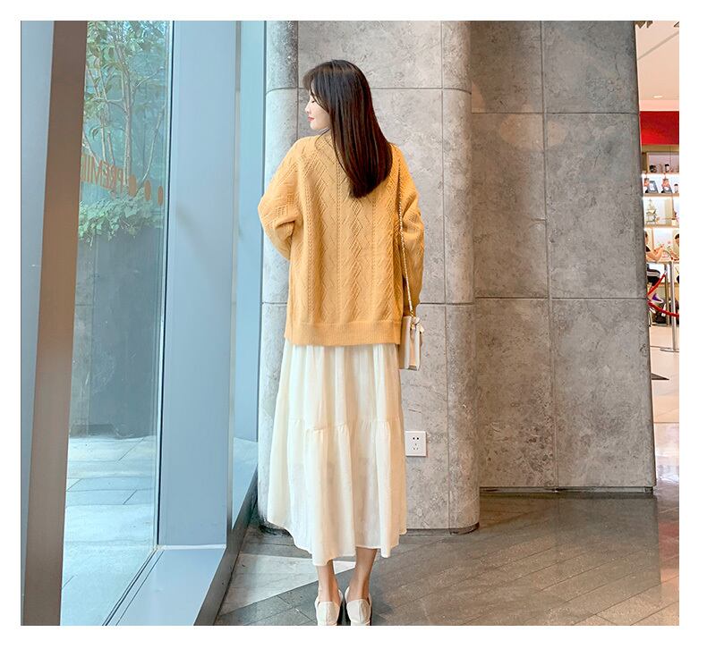 編み柄が可愛いクルーネックカーディガンとレース調の柄がエレガントなボウタイ付き、ティアードワンピースの2点セットです。