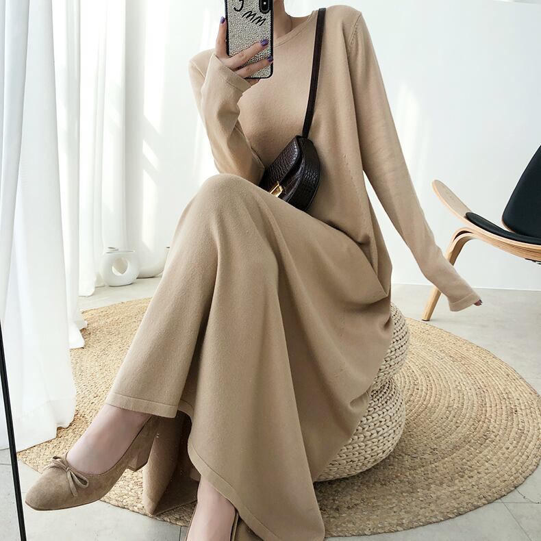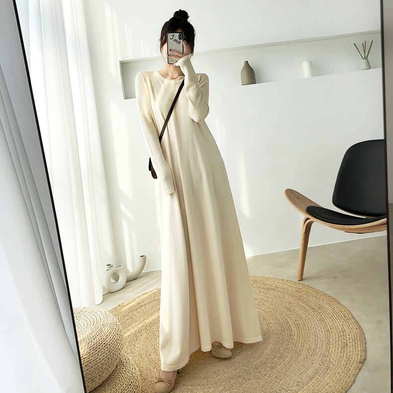 ワンピース Tシャツ ロング ロング丈 マキシ マキシ丈 長袖 萌袖 ラウンドネック セミフレア ストレート Aライン 伸縮性 かわいい 大人可愛い きれいめ シンプル カジュアル 大人 おしゃれ お洒落 大人女子 こなれ感 ラフ ガーリー ルーズ モード系 モダン 抜け感 M L XL ゆったり ゆる 黒 ブラック 緑 グリーン オフホワイト ベージュ ピンク くすみカラー 大人カラー 無地 春 秋 レディース ママ お出かけ 休日 着回し 普段使い 韓国系 オルチャン 楽ちん 体型カバー 定番