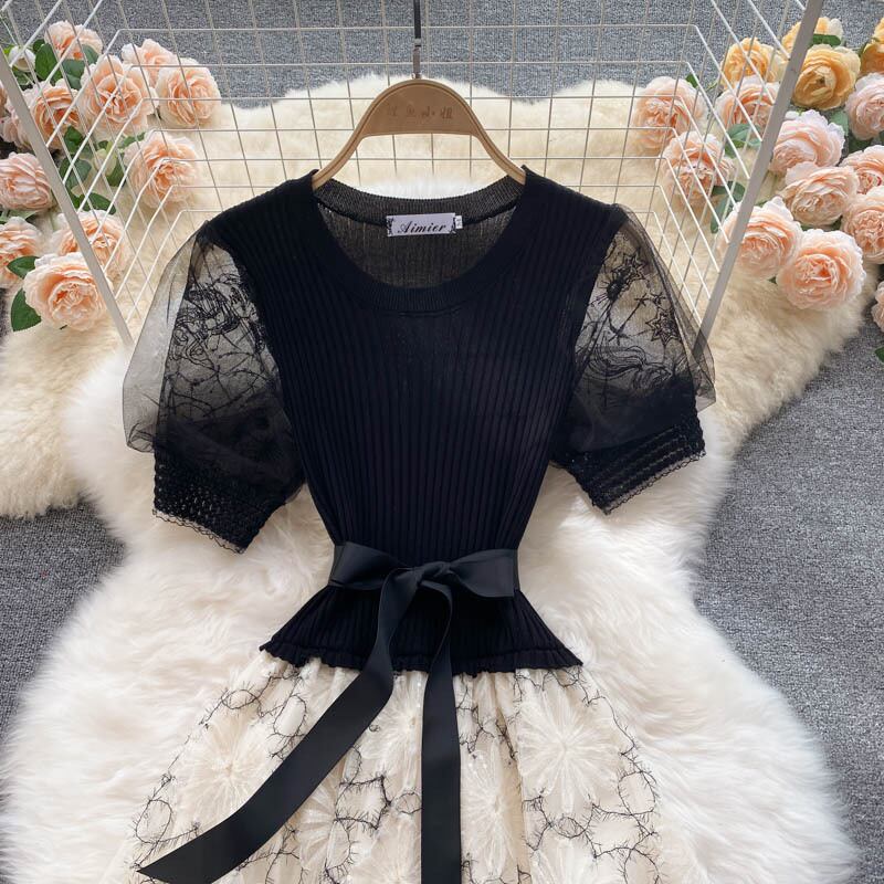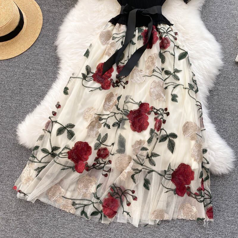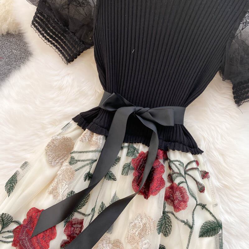 ドレス ワンピース ワンピースドレス ワンピドレス ミモレ ミモレ丈 半袖 パフスリーブ ラウンドネック プリンセス プリンセスライン 切り替えデザイン 刺繍 チュール リボン ウエストマーク ウエストリボン エレガント かわいい 大人可愛い 華やか 大人 上品 おしゃれ お洒落 レトロ 存在感 ガーリー 個性的 モード系 モダン S M L XL 2XL 白 ホワイト 黒 ブラック 大人カラー モノトーン 柄 花柄 小花柄 フラワー お呼ばれ パーティー レディース イベント 高見え インスタ映え