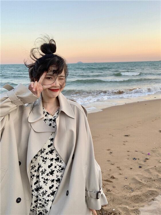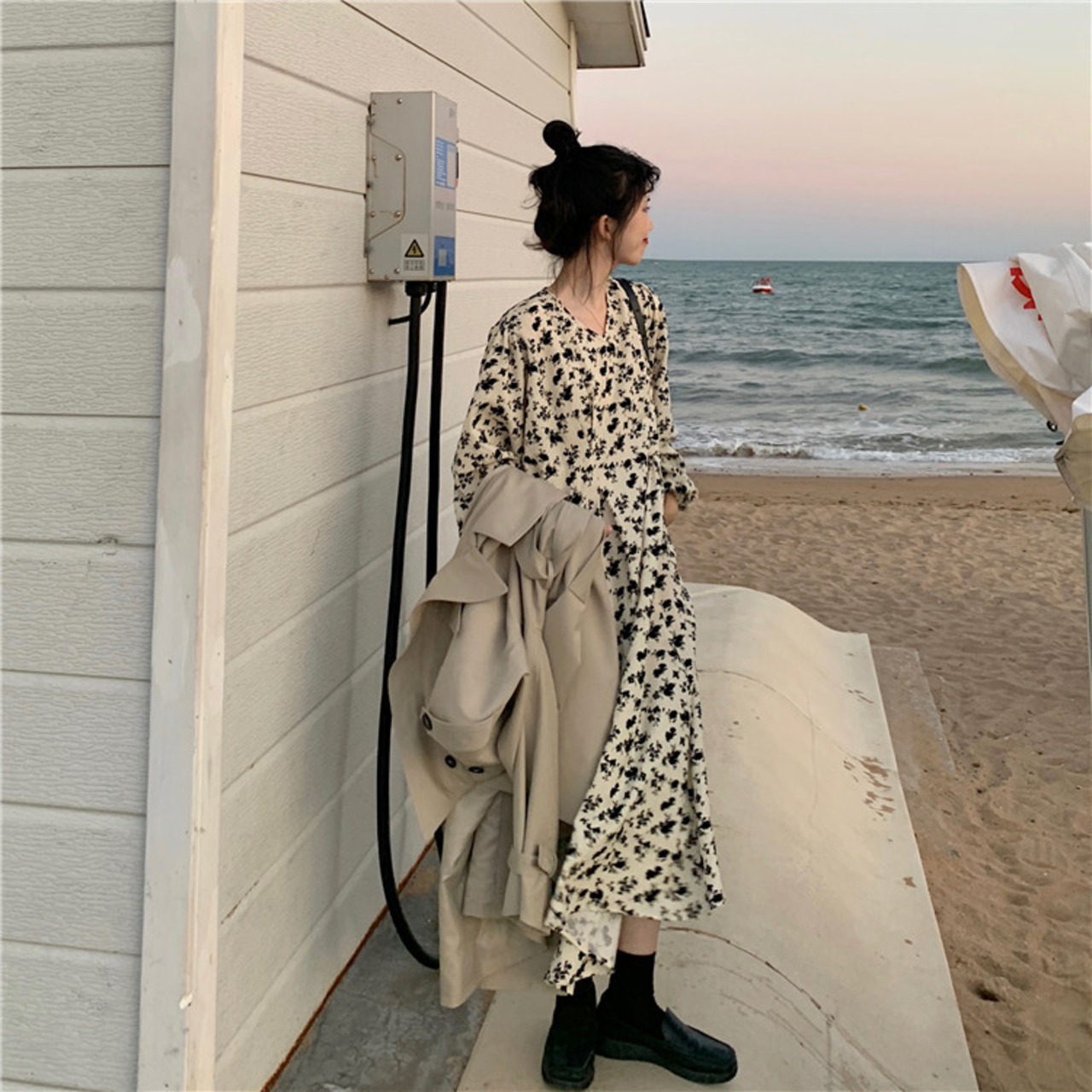 花柄の長袖ワンピースとカジュアルなロングコートのセットです。コーディネートに悩みがちな方におすすめのアイテムです。