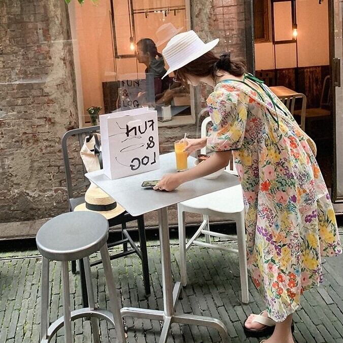 背中部分にデザイン性がある、かわいいパステルフラワーのワンピース。