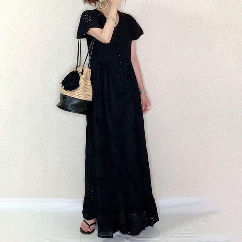 上品でかわいい刺繍ロング丈ワンピース。