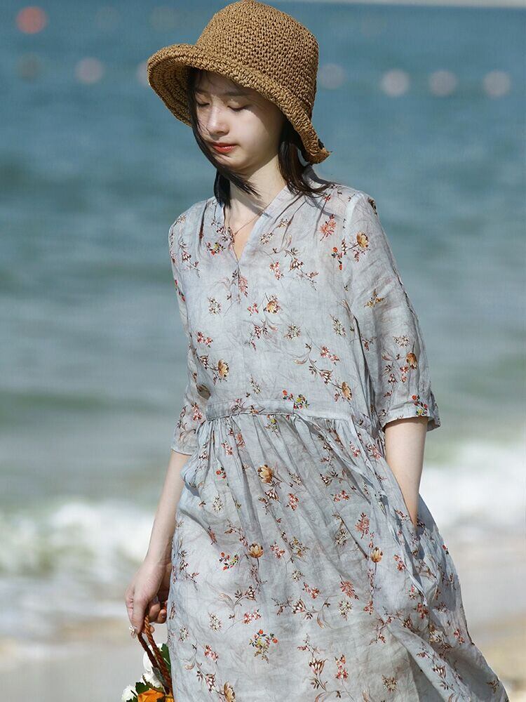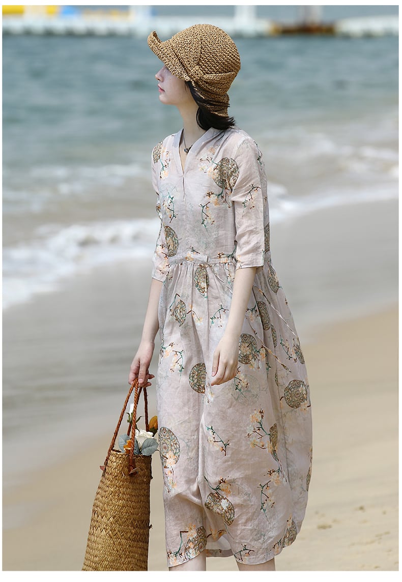 ワンピース 花柄 ハイウエスト 5分丈 ミドル丈 袖あり Vネック 襟なし Aライン ウエストマーク リネン コットン かわいい 大人可愛い きれいめ 大人 上品 おしゃれ お洒落 大人女子 こなれ感 ラブリー キュート ガーリー ルーズ エレガント 存在感 夏 10代 20代 レディース 女性用 女の子 オフィス OL 通勤 学生 デート お出かけ 女子会 お泊まり 休日 リゾート 旅行 海 プール 高原 ファッション コーデ スタイル モテ トレンド S M L XL 2XL ブルー 青 アプリコット