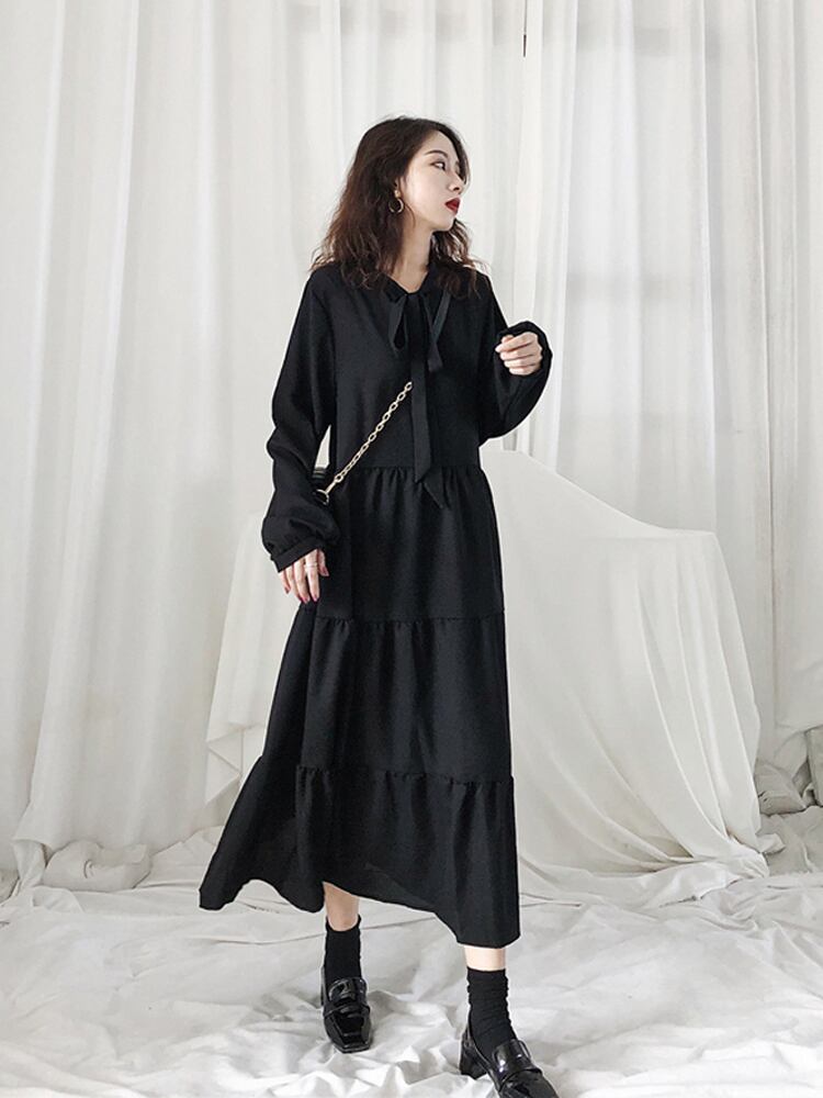 ワンピース ロング丈 袖あり 長袖 襟付き ボウタイ フレア デザイン 美ライン ニュアンス ティアード リボン モノトーン かわいい 大人可愛い きれいめ シンプル カジュアル 大人 上品 おしゃれ お洒落 大人可愛い 大人女子 こなれ感 ラブリー キュート ガーリー 個性的 エレガント モダン 主役級 存在感 抜け感 ベーシック ヨーロッパカジュアル ブリティッシュ スタンダード 洗練 無地 エイジレス レディース お出かけ 旅行 着回し 普段使い 重ね着 お揃い 双子 ファッション