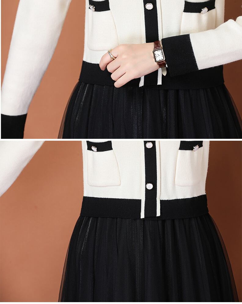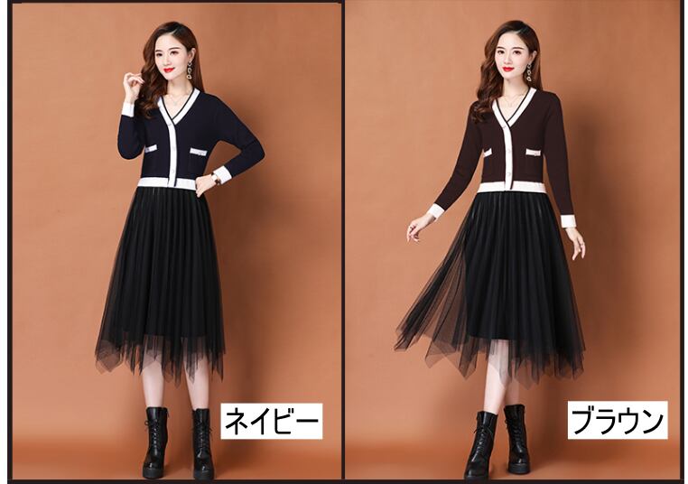 ワンピース ワンピドレス 膝丈 ひざ丈 膝下 長袖 Vネック フレア 切り替えデザイン チュール ドッキング ニット かわいい 大人可愛い きれいめ 大人 上品 おしゃれ お洒落 大人女子 こなれ感 ガーリー 個性的 モード系 エレガント モダン 抜け感 M L XL 2XL 3XL 白 ホワイト 黒 ブラック 茶色 ブラウン ネイビー 大人カラー バイカラー モノトーン 秋カラー 無地 秋 レディース OL 通勤 デート お出かけ イベント 韓国 韓国系 オルチャン コーデ 楽ちん モテ インスタ映え