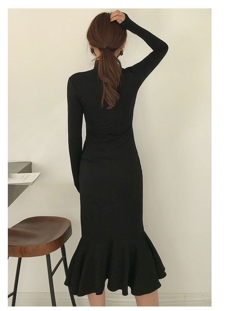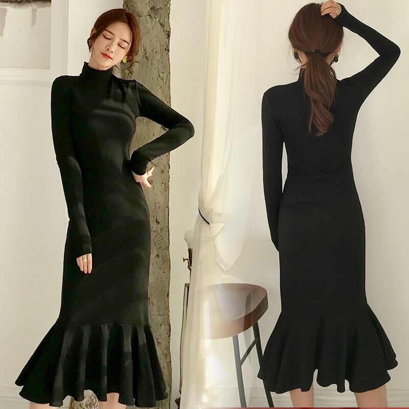 ワンピース ワンピドレス ミモレ ミモレ丈 長袖 萌袖 ハイネック スリム タイト 細身 マーメイド 裾フレア 伸縮性 かわいい 大人可愛い きれいめ シンプル カジュアル 大人 上品 おしゃれ お洒落 大人女子 こなれ感 ラフ モード系 セクシー エレガント モダン 抜け感 XS S M L XL 2XL 小さいサイズ 大きいサイズ 黒 ブラック 大人カラー モノトーン 無地 秋 冬 レディース OL 通勤 デート お出かけ 着回し 普段使い 韓国 韓国系 オルチャン スタイル 楽ちん モテ 定番