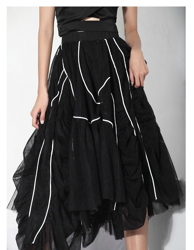 スカート ボトムス チュールスカート ミモレ ミモレ丈 アシンメトリー シャーリング ギャザー チュール ウエストゴム 透け感 パイピング かわいい 大人可愛い きれいめ 大人 上品 おしゃれ お洒落 スタイリッシュ 大人女子 こなれ感 ラフ キュート ガーリー 個性的 クール モード系 エレガント モダン 主役級 存在感 S M L XL 白 ホワイト 黒 ブラック 大人カラー モノトーン 無地 春 夏 レディース お出かけ パーティー イベント 韓国 韓国系 オルチャン 楽ちん インスタ映え
