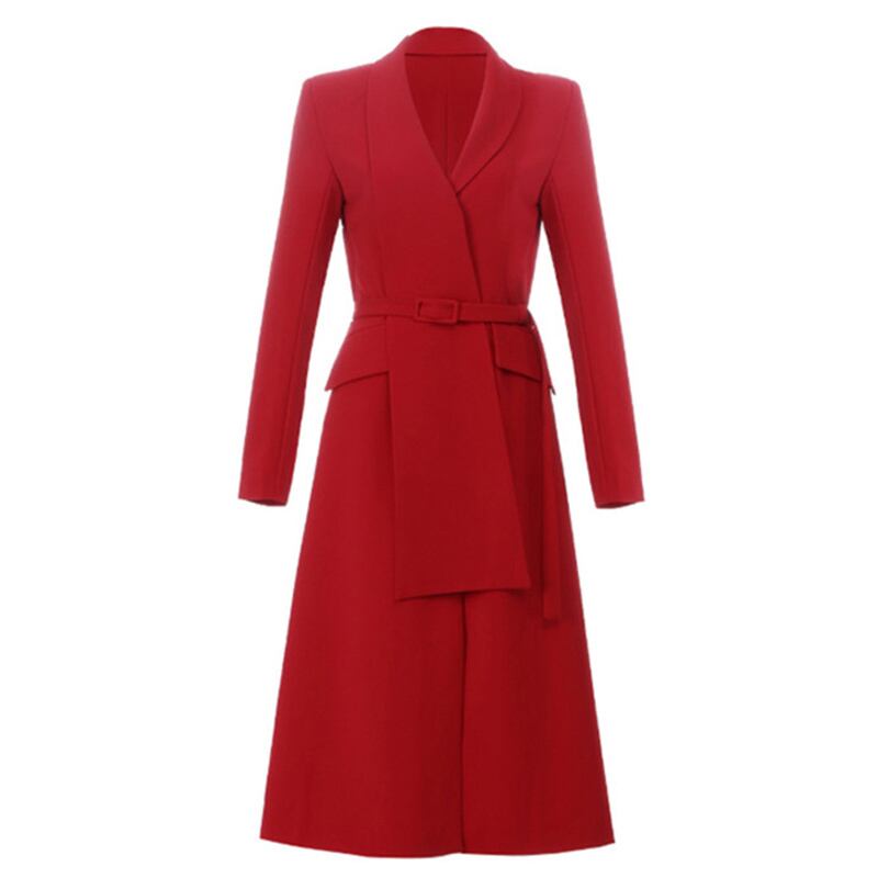 変形したラペルにベルトのウエストマークがポイントのモダンな一着となっています。