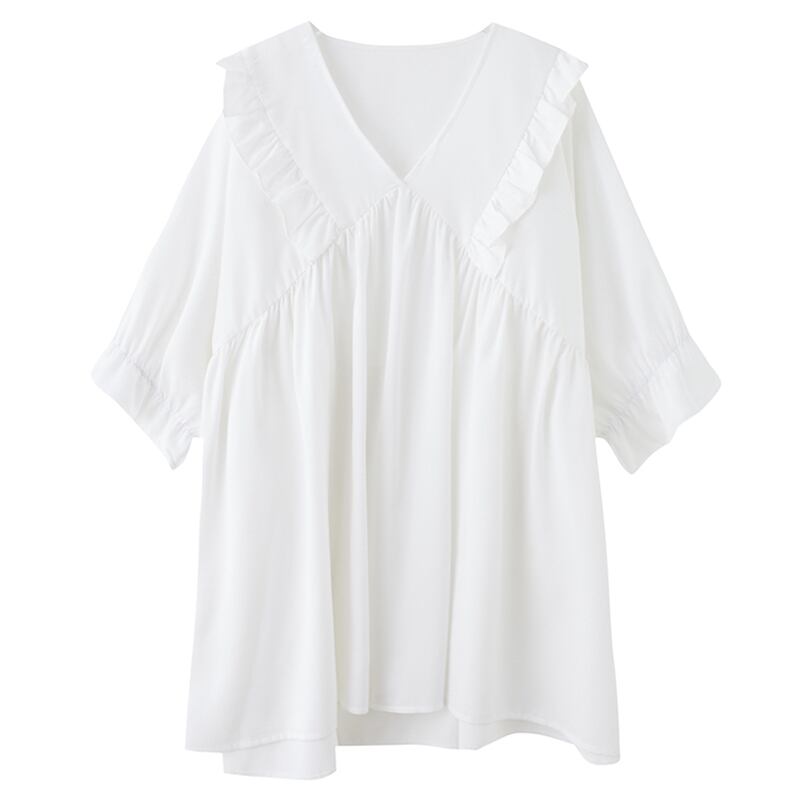 トップス ブラウス プルオーバー 白トップス 袖あり 長袖 ドルマンスリーブ Vネック フレア セミフレア フリル アシンメトリー 綿 かわいい 大人可愛い きれいめ シンプル 大人 上品 おしゃれ お洒落 大人女子 ラフ ルーズ 主役級 存在感 フォーマル フェミニン シック 大人カジュアル 無地 春 秋 20代 30代 レディース 女性用 ビジネス OL 通勤 デート お出かけ 女子会 休日 パーティー イベント 旅行 普段使い 韓国 ファッション コーデ 楽ちん 体系カバー L ワンサイズ 白