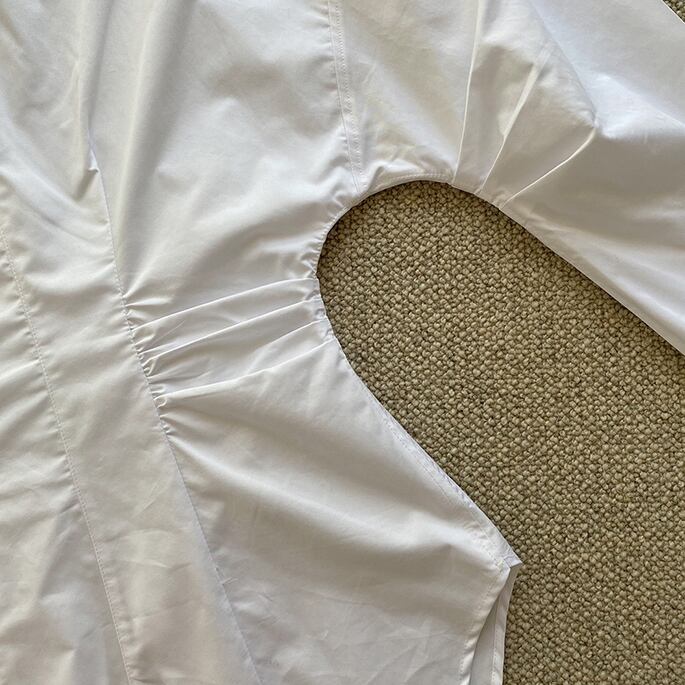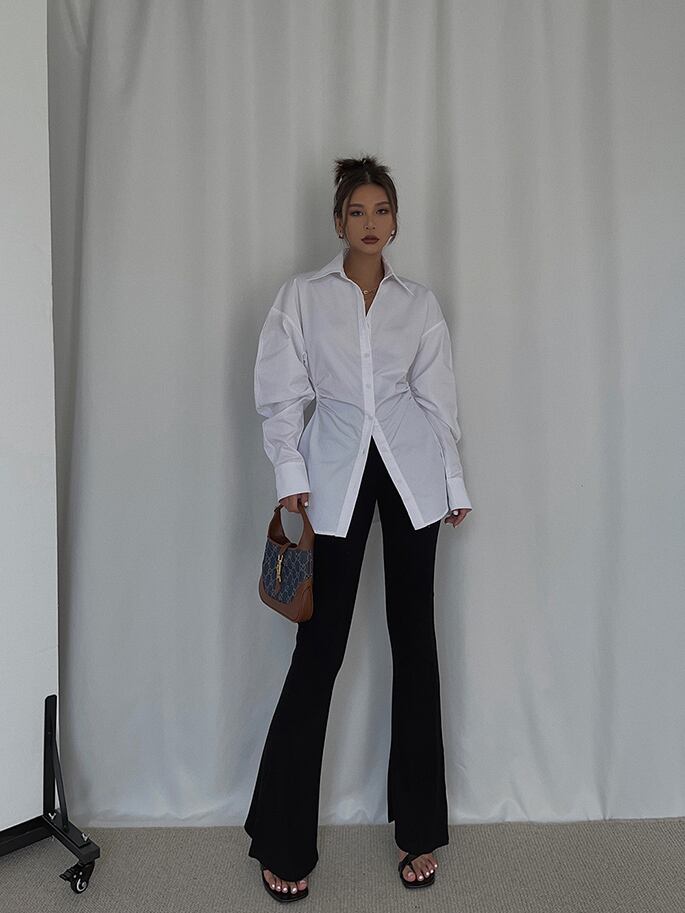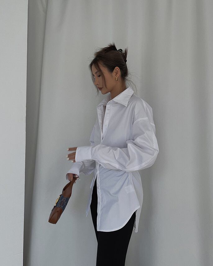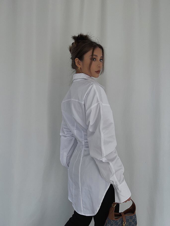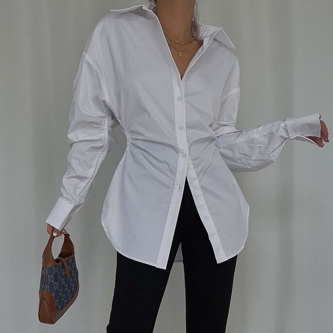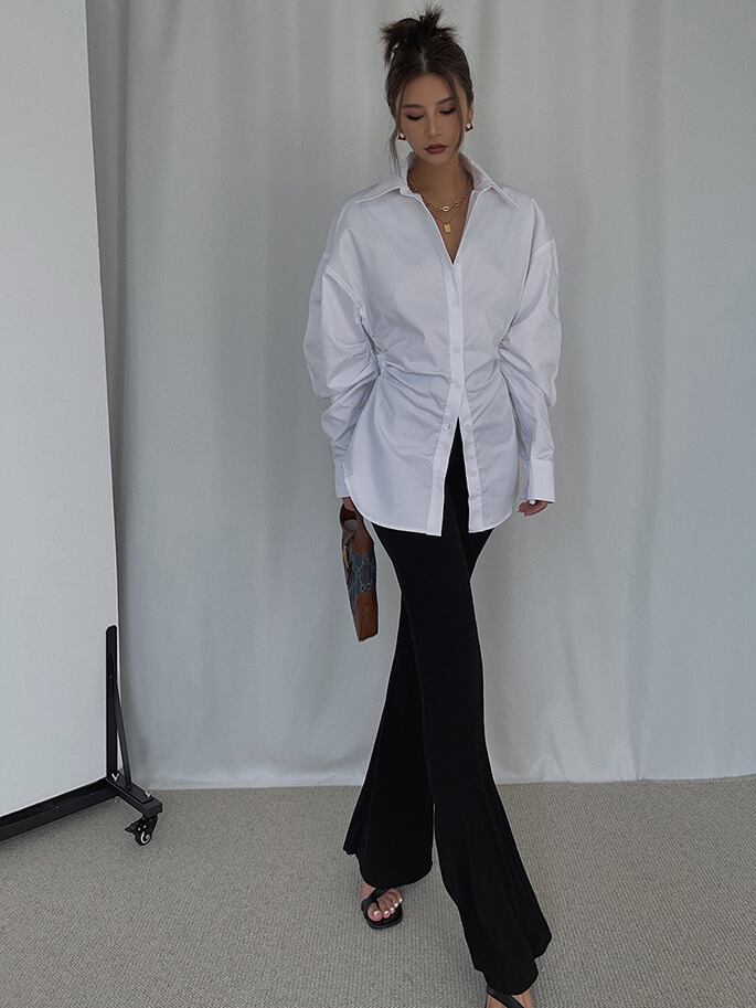 Xライン トップス シャツ 白シャツ ミディアム丈 半端丈 長袖 ボリューム袖 襟付き スタンドカラー スリム ギャザー 前開き ボタン かわいい 大人可愛い きれいめ シンプル カジュアル 大人 上品 おしゃれ お洒落 かっこいい スタイリッシュ 大人女子 こなれ感 個性的 クール モード系 セクシー エレガント モダン 主役級 存在感 S M L 白 ホワイト モノトーン 無地 春 秋 レディース お出かけ パーティー イベント 韓国 韓国系 オルチャン コーデ スタイル トレンド インスタ映え