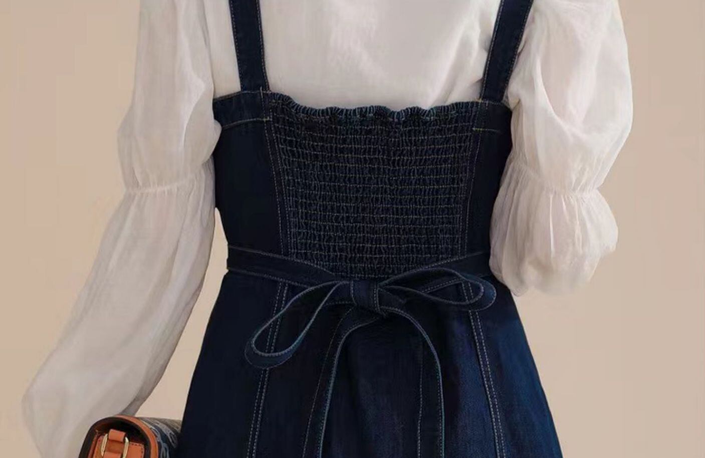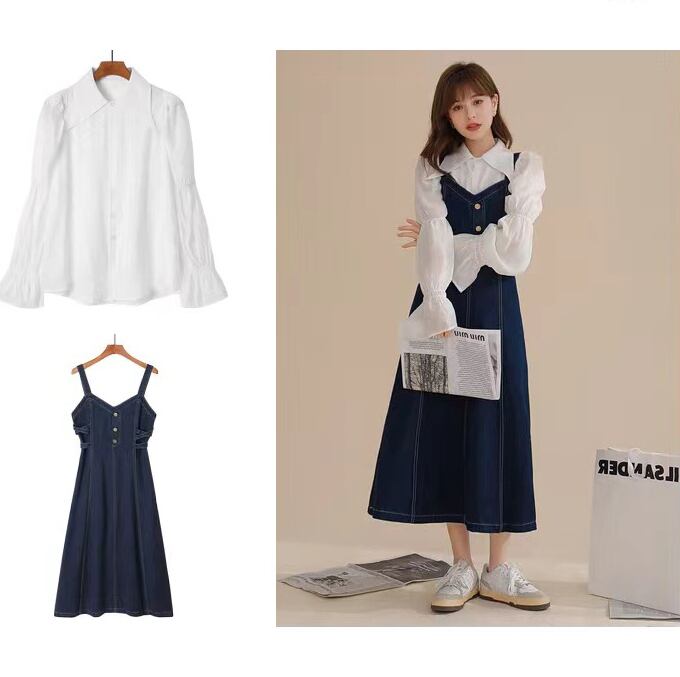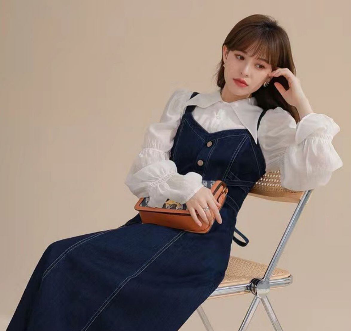 トップス スカート ワンピース シャツ ブラウス 白シャツ デニムスカート デニムワンピース ミモレ ミモレ丈 袖あり 長袖 ボリューム袖 Vネック 角襟 セミフレア デニム 上下セット 2点セット かわいい 大人可愛い シンプル おしゃれ ラフ キュート ガーリー 無地 春 秋 10代 20代 30代 レディース 女性用 学生 通学 デート お出かけ 女子会 お泊まり アウトドア イベント レストラン ショッピング 韓国 韓国系 楽ちん モテ サイズ S M L 色展開 ネイビーブルー ホワイト