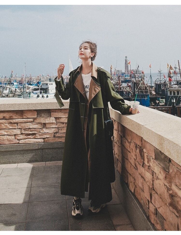 グリーンとベージュのバイカラー配色がかっこかわいいトレンチコート
