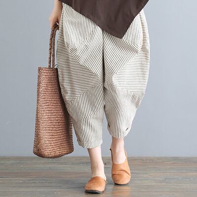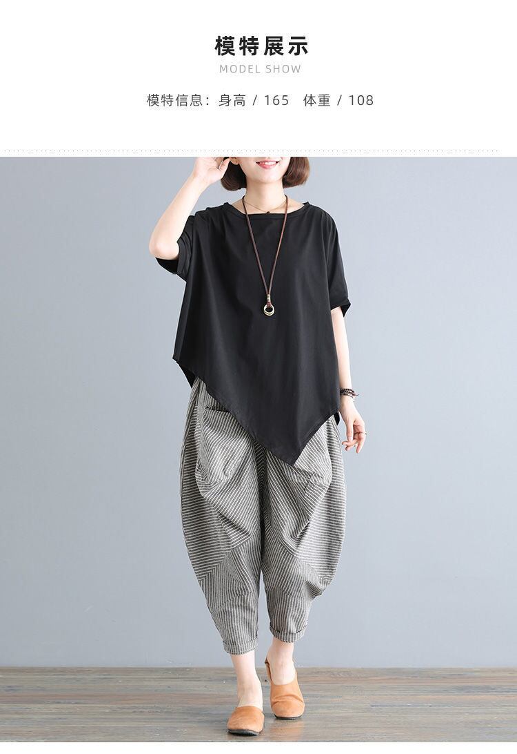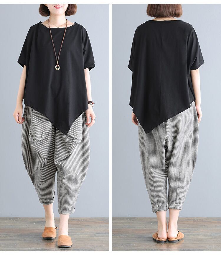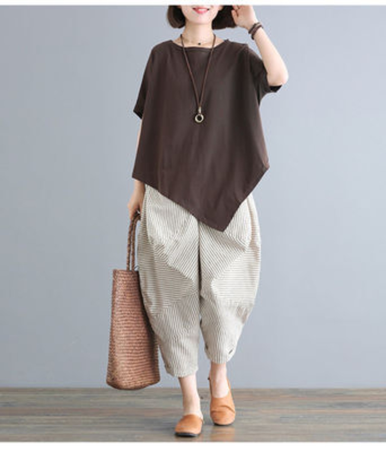 アシンメトリーな裾のカットがデザイン的なトップスと、ストライプ地で立体的なパターンにゆったりとしたシルエットのパンツの上下2点セットになります。