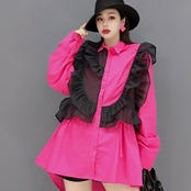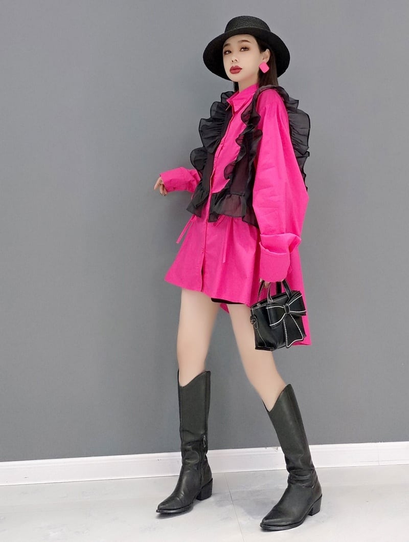 ショッキングピンクにブラックのフリルがあしらわれたデザイン性の高いトップス