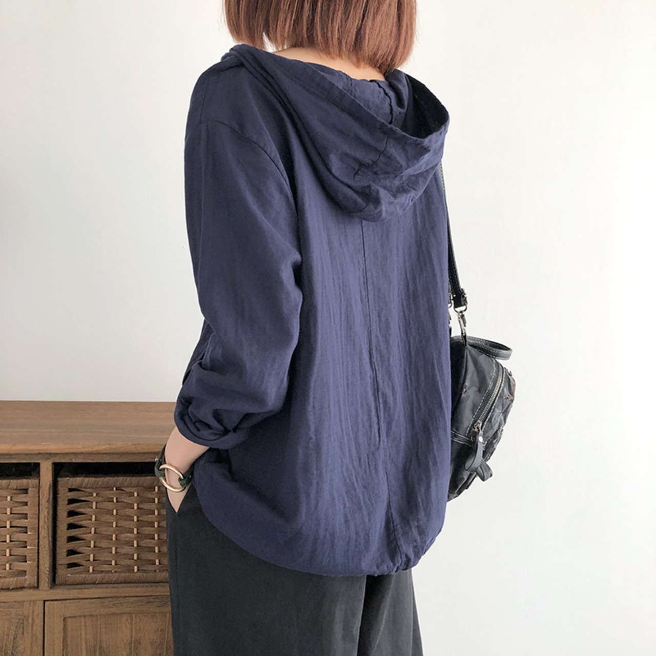 天然素材の風合いがこなれた雰囲気のフード付きのプルオーバーです。