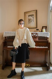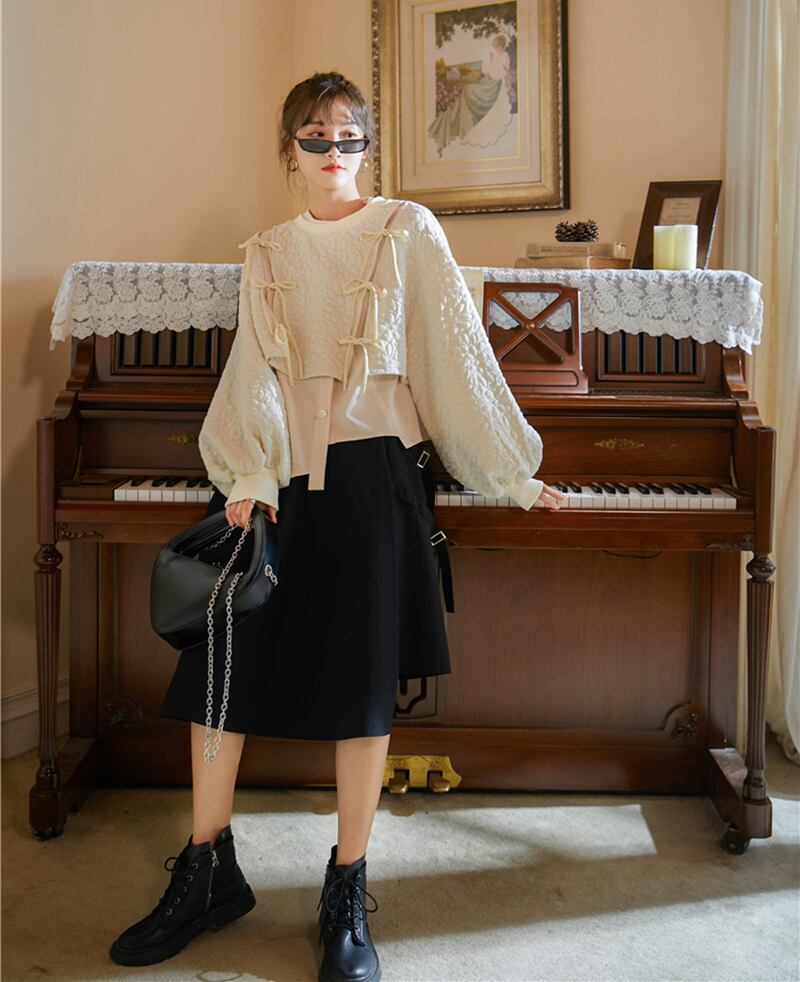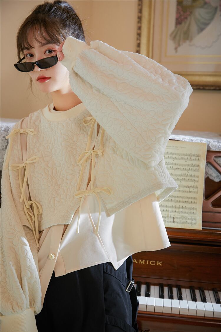 トップス プルオーバー カットソー ボリューム袖 長袖 オフホワイト 秋 ブラウス ショート ショート丈 袖あり ラウンドネック 襟なし ストレート アシンメトリー 切り替えデザイン リボン スリット バックスリット もこもこ キルティング かわいい 大人可愛い 大人 おしゃれ お洒落 レトロ アジアン 大人女子 こなれ感 ラブリー キュート ガーリー ルーズ 個性的 存在感 花柄 フラワー 10代 20代 レディース 女性用 普段使い ファッション コーデ スタイル モテ トレンド インスタ映え