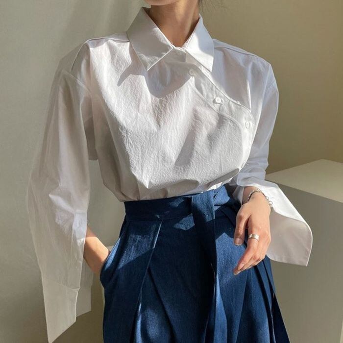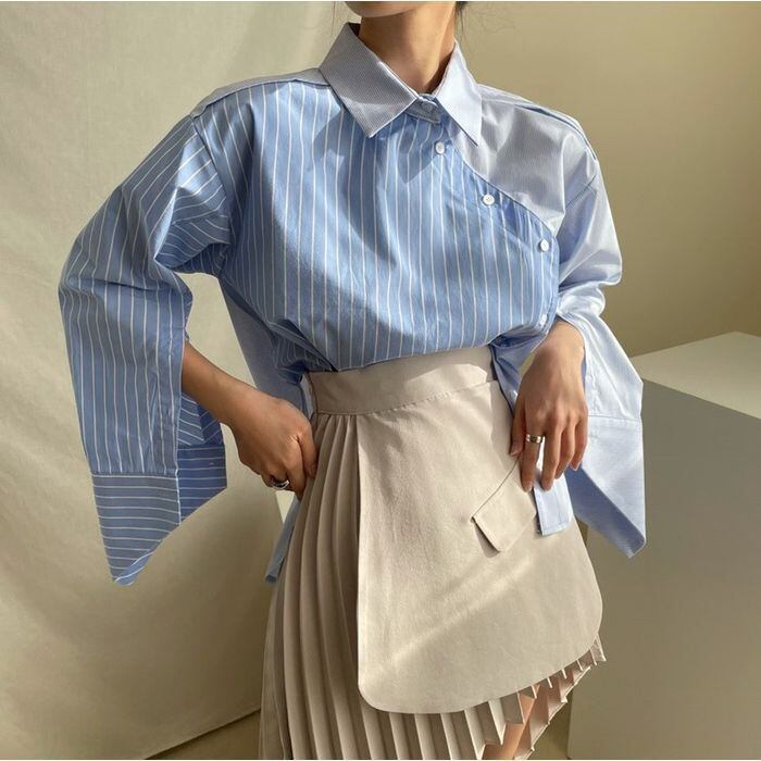 トップス シャツ ミディアム丈 半端丈 長袖 襟付き ストレート ワイド アシンメトリー 切り替えデザイン ラージカフス 前開き ボタン かわいい 大人可愛い きれいめ カジュアル 大人 おしゃれ お洒落 大人女子 こなれ感 ラフ ガーリー ルーズ 個性的 モード系 エレガント モダン 主役級 存在感 抜け感 ゆったり ゆる 大人カラー 無地 柄 ストライプ 春 秋 レディース お出かけ イベント 普段使い 重ね着 韓国 韓国系 オルチャン ファッション コーデ 楽ちん インスタ映え 大きいサイズ