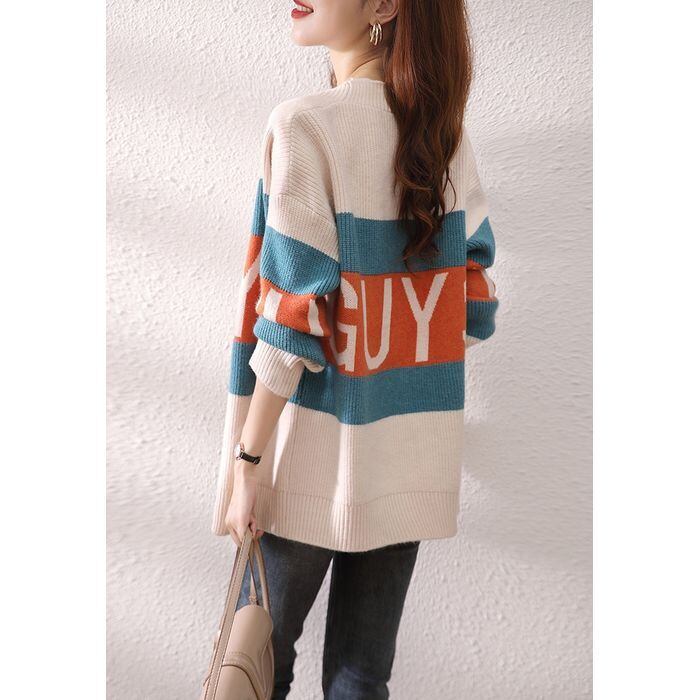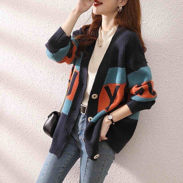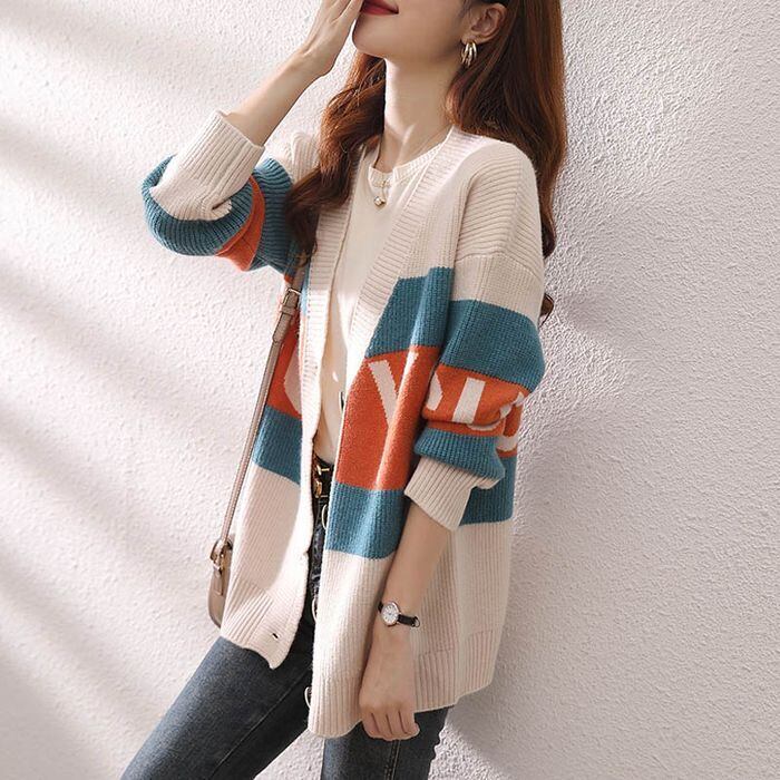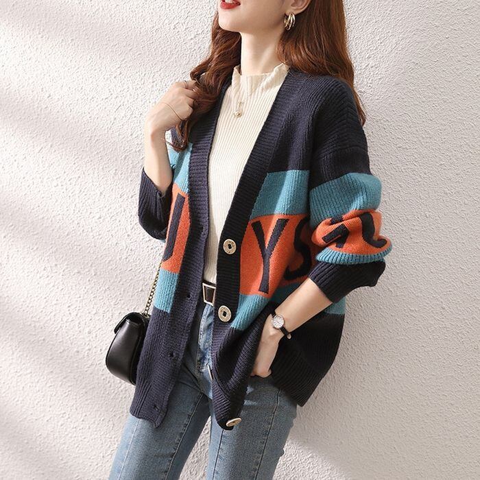 レタリング入りのカラーブロックが可愛いニットカーディガンです。