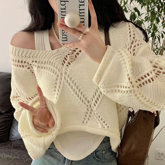 セット アンサンブル デザイン オープンニット ニット トップス キャミソール アシンメトリー 袖あり 長袖 襟付き デザイン 美ライン ニュアンス ツーピース お得 かわいい 大人可愛い きれいめ シンプル カジュアル 大人 上品 おしゃれ お洒落 大人可愛い 大人女子 こなれ感 ラブリー キュート ガーリー 個性的 エレガント モダン 主役級 存在感 抜け感 ベーシック ヨーロッパカジュアル ブリティッシュ スタンダード 洗練 無地 エイジレス レディース お出かけ 旅行 着回し 普段使い 重ね着