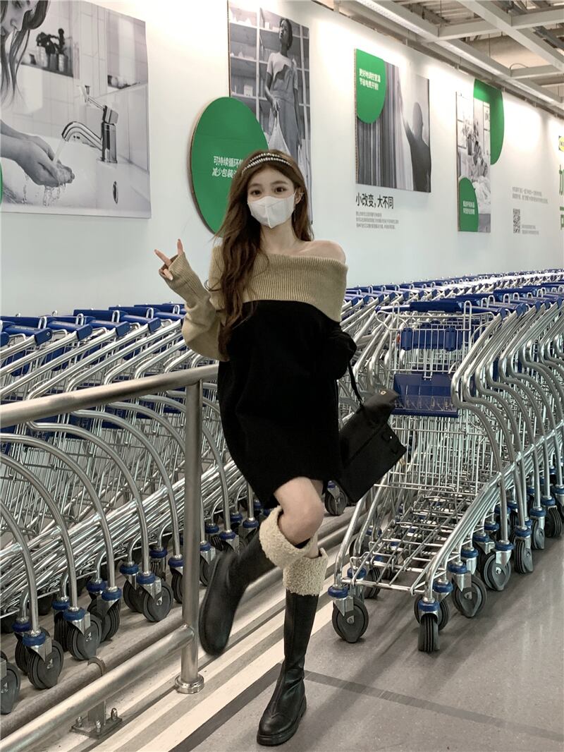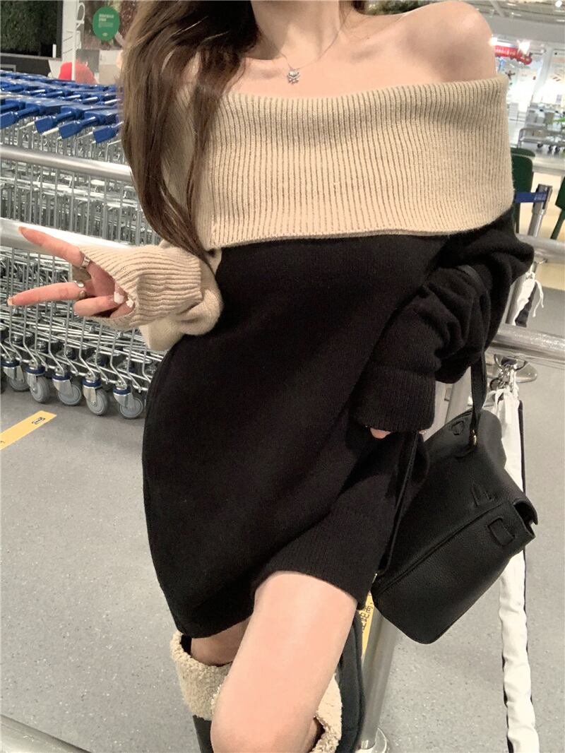 ニットワンピース ワンピース ニットソー セーター ミニ ミニ丈 膝上 半端丈 長袖 萌袖 オフショルダー オフショル ストレート 切り替えデザイン 伸縮性 ニット かわいい 大人可愛い きれいめ シンプル カジュアル 大人 上品 おしゃれ お洒落 大人女子 こなれ感 ラフ ガーリー ルーズ モード系 セクシー エレガント モダン 抜け感 フリーサイズ ゆったり ワンサイズ 黒 ブラック オフホワイト 大人カラー バイカラー 無地 秋 冬 レディース デート お出かけ 着回し 普段使い オルチャン モテ