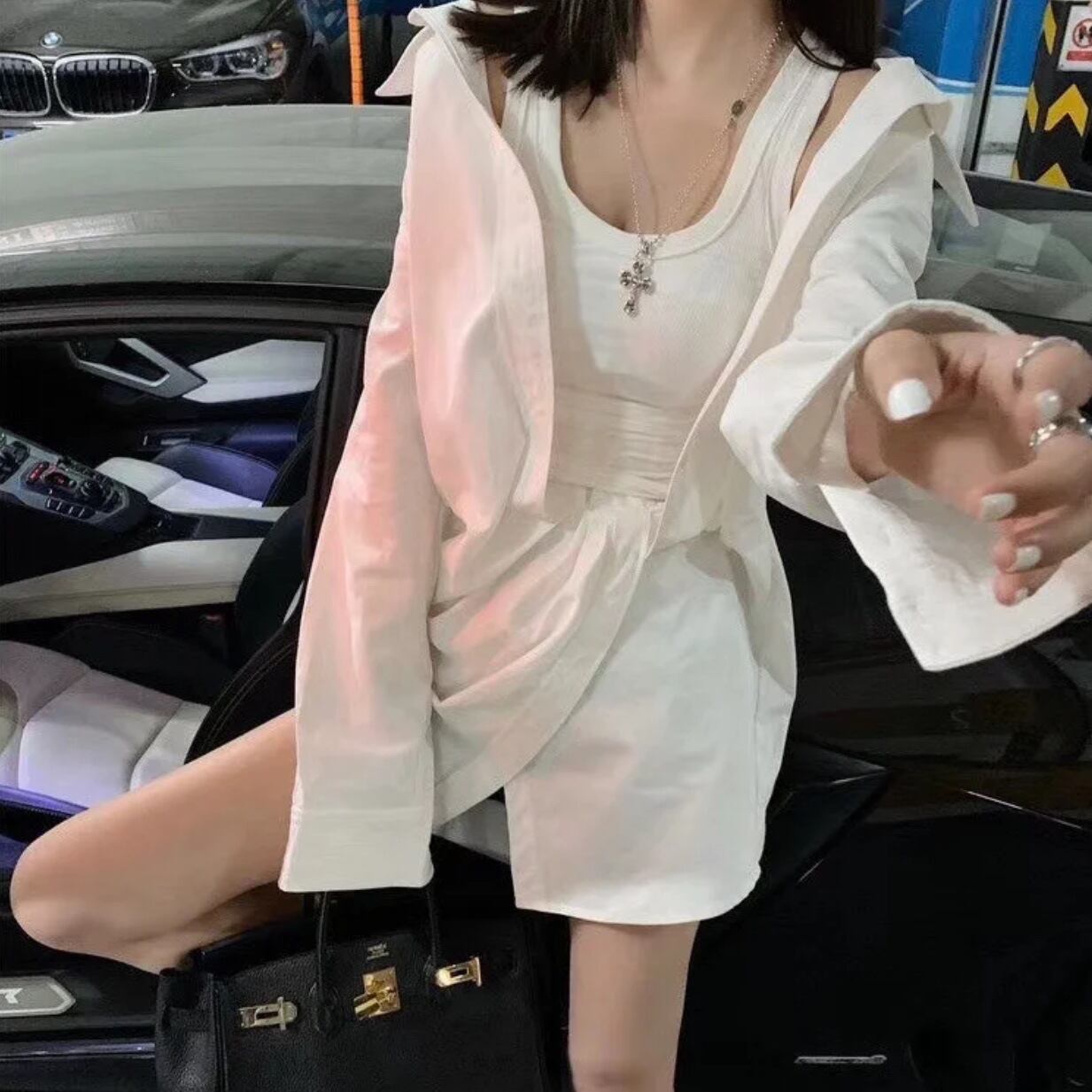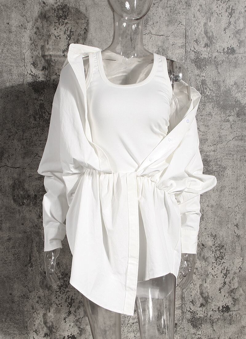 ワンピース ツーピース プルオーバー シャツ 白シャツ ショート丈 スカート ラウンドネック ハイウエスト レギュラー 無地 通勤 オフホワイト 春 長袖 S M L ワンピドレス シャツワンピース ショート 袖あり 襟付き ストレート ウエストマーク 2点セット かわいい 大人可愛い カジュアル 大人 おしゃれ お洒落 大人女子 こなれ感 ラフ スポーティ ルーズ 個性的 セクシー 抜け感 10代 20代 レディース 女性用 オフィス OL お出かけ 休日 リゾート ファッション コーデ スタイル モテ