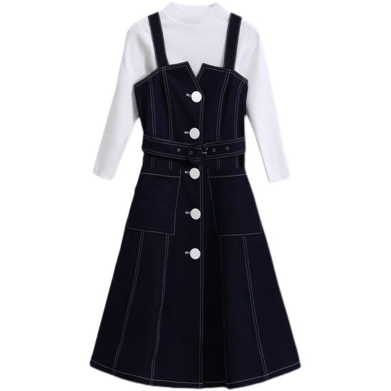 ワンピース デニムスカート 膝丈 膝下 袖あり 7分袖 ハイネック セミフレア Aライン ポリエステル ブルーデニム かわいい 大人可愛い きれいめ カジュアル 大人 上品 おしゃれ お洒落 大人女子 こなれ感 ラフ ラブリー キュート ガーリー 無地 春 秋 10代 20代 30代 レディース 女性用 学生 通学 デート お出かけ レストラン ショッピング 着回し 普段使い 重ね着 韓国 韓国系 ファッション モテ 体系カバー 美脚 トレンド 流行 インスタ映え サイズ L 2XL 色展開 ブルー
