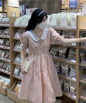 ドールカラー ワンピース ティアードワンピース ワンピドレス 膝丈 ひざ丈 膝下 半端丈 半袖 パフスリーブ ラウンドネック 襟付き ペプラム 切り替えデザイン ギャザー ティアード フリル リボン ボタン かわいい カジュアル 上品 おしゃれ お洒落 レトロ ラブリー キュート ガーリー 個性的 モード系 主役級 存在感 S M L XL 青 ブルー ピンク パステルカラー 無地 春 夏 10代 20代 レディース 女の子 デート お出かけ パーティー イベント 韓国系 オルチャン インスタ映え