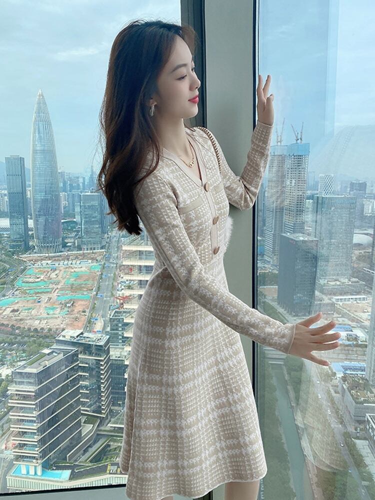 ワンピース ニット ニットスカート 膝丈 ミドル丈 袖あり 長袖 Vネック かわいい 大人可愛い きれいめ シンプル カジュアル 大人 おしゃれ お洒落 大人女子 こなれ感 ラブリー キュート ガーリー 柄 千鳥格子 春 秋 冬 10代 20代 30代 レディース 女性用 学生 通学 デート お出かけ 女子会 旅行 リゾート レストラン ショッピング 着回し 普段使い 重ね着 韓国 韓国系 ファッション モテ 体系カバー 美脚 トレンド 流行 インスタ映え サイズ S M L XL 色展開 カーキ