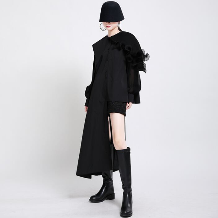 トップス シャツ ブラウス 不規則丈 袖あり 長袖 ボリューム袖 Uネック 襟付き ワイド 裾ワイド レース シフォン フリル 大人可愛い きれいめ 大人 上品 おしゃれ お洒落 かっこいい ルーズ 個性的 クール モード系 モダン 主役級 存在感 無地 春 秋 冬 10代 20代 30代 レディース 女性用 お出かけ 女子会 パーティー イベント レストラン ショッピング 韓国 韓国系 ファッション コーデ スタイル トレンド インスタ映え サイズ フリーサイズ 色展開 ブラック グリーン ホワイト