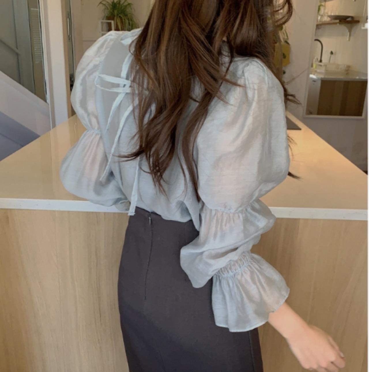 軽やかなシフォンの透け感と、袖のギャザーとボリュームが特徴的なブラウスです。