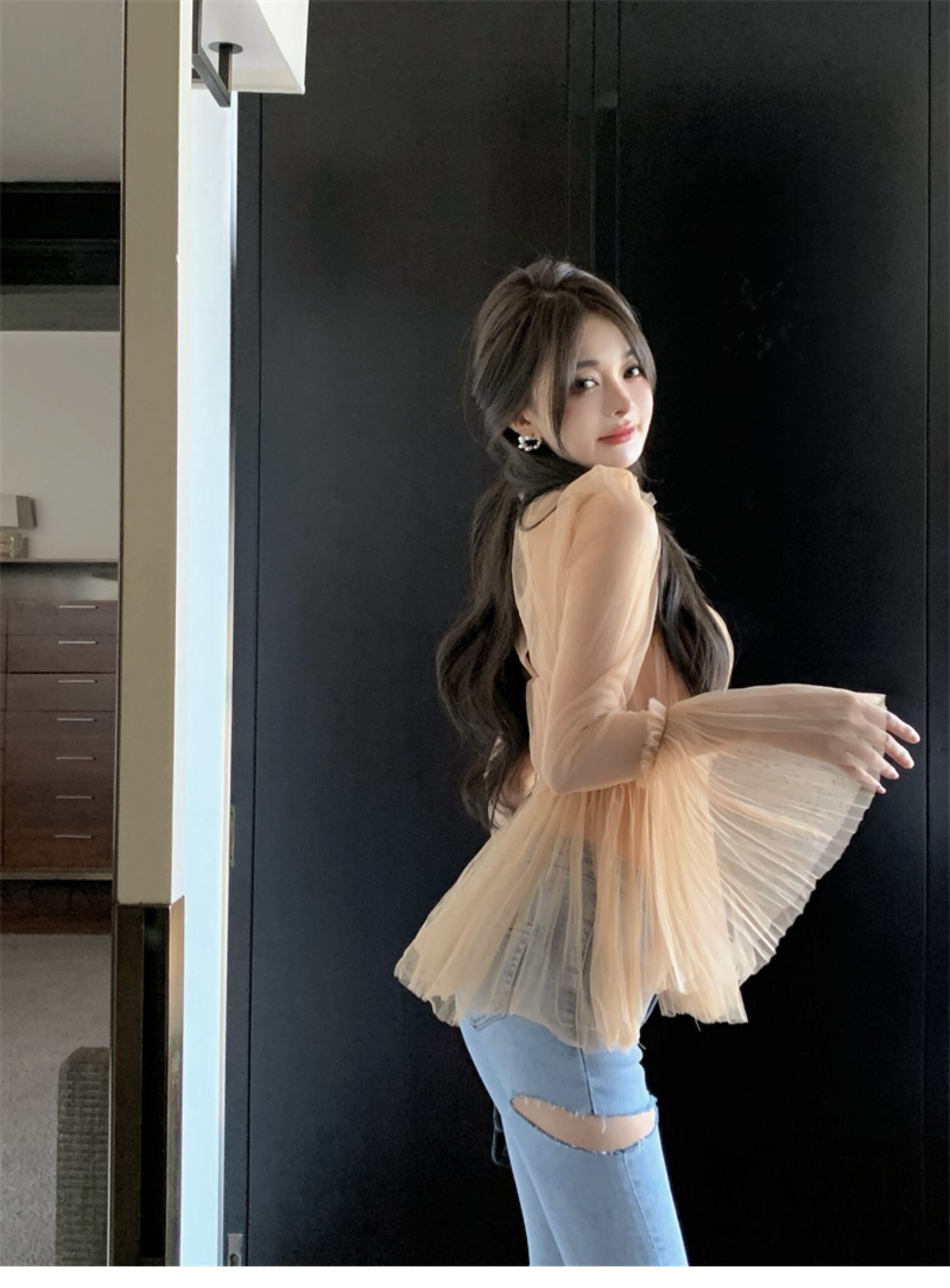 トップス ブラウス 長袖 フレアスリーブ ハイネック デザイン ギャザー 美ライン ニュアンス プリーツ シフォン 透け感 シースルー 軽やか カラバリ ロマンチック かわいい 大人可愛い きれいめ シンプル カジュアル 大人 上品 おしゃれ お洒落 大人可愛い 大人女子 こなれ感 ラブリー キュート ガーリー 個性的 エレガント モダン 主役級 存在感 抜け感 ベーシック ヨーロッパカジュアル ブリティッシュ スタンダード 洗練 柄 エイジレス レディース お出かけ 旅行 着回し 普段使い 重ね着