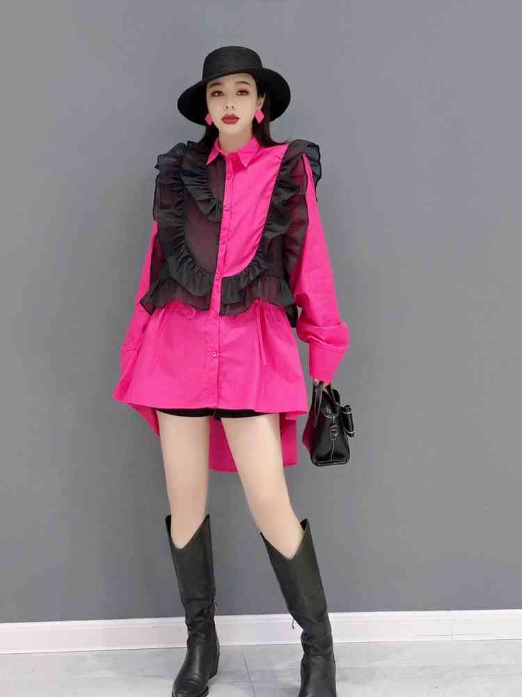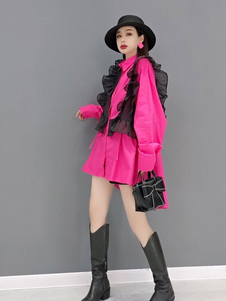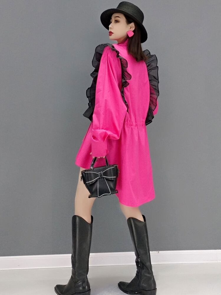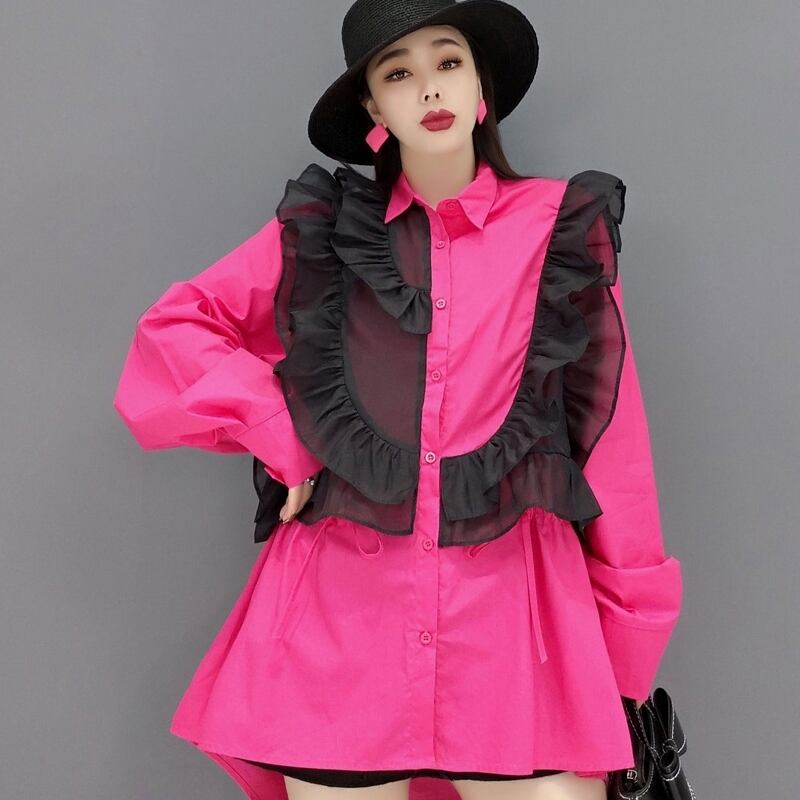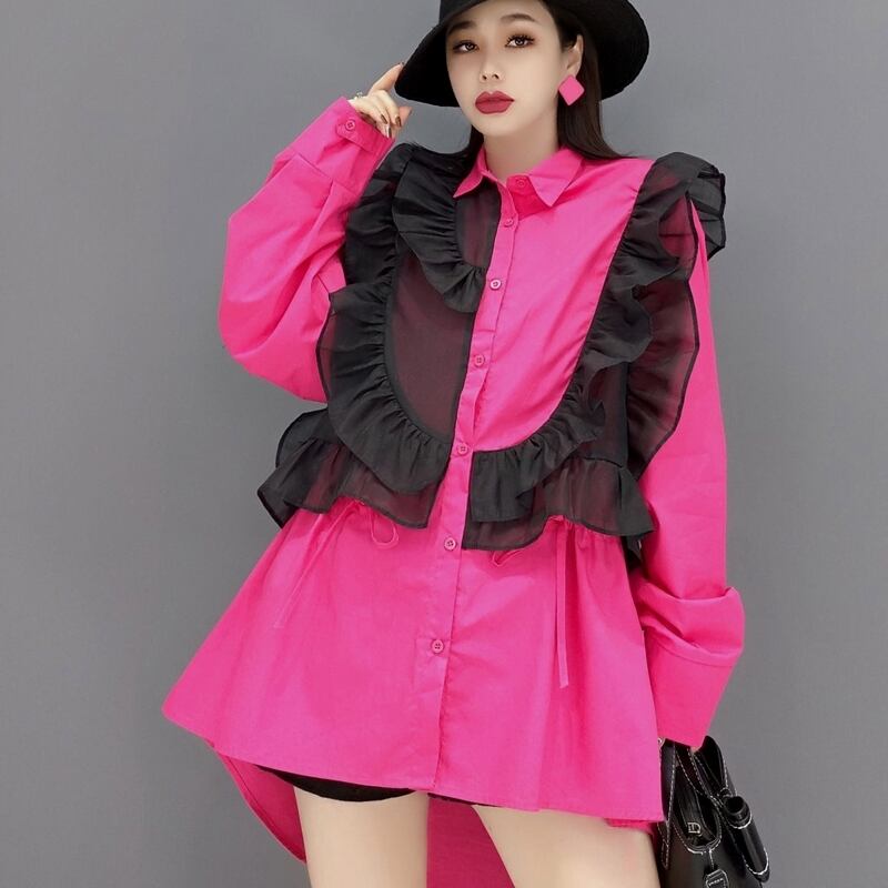 トップス シャツ ブラウス メッシュ フリル ビッグシルエット ミディアム丈 半端丈 長袖 ボリューム袖 襟付き ストレート ワイド Aライン 切り替えデザイン ギャザー ティアード フリル かわいい 大人可愛い きれいめ カジュアル 大人 上品 おしゃれ お洒落 レトロ 大人女子 こなれ感 ラフ ガーリー ルーズ モード系 エレガント モダン S M ビビッドカラー バイカラー ゆったり ゆる ピンク 無地 春 夏 レディース ママ デート お出かけ 着回し 普段使い 楽ちん 体型カバー オーバーサイズ