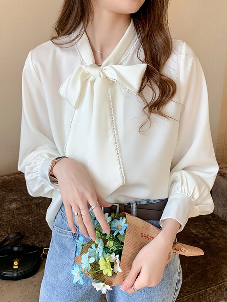 トップス ブラウス レギュラー丈 袖あり 長袖 ボリューム袖 Vネック レース リボン かわいい 大人可愛い きれいめ シンプル 大人 おしゃれ お洒落 大人女子 こなれ感 ラブリー キュート ガーリー 無地 春 10代 20代 30代 レディース 女性用 オフィス ビジネス OL 通勤 学生 通学 デート お出かけ お泊まり 休日 パーティー イベント レストラン ショッピング 普段使い 韓国 韓国系 コーデ スタイル モテ トレンド サイズ S M L XL 2XL 色展開 ホワイト ブルー