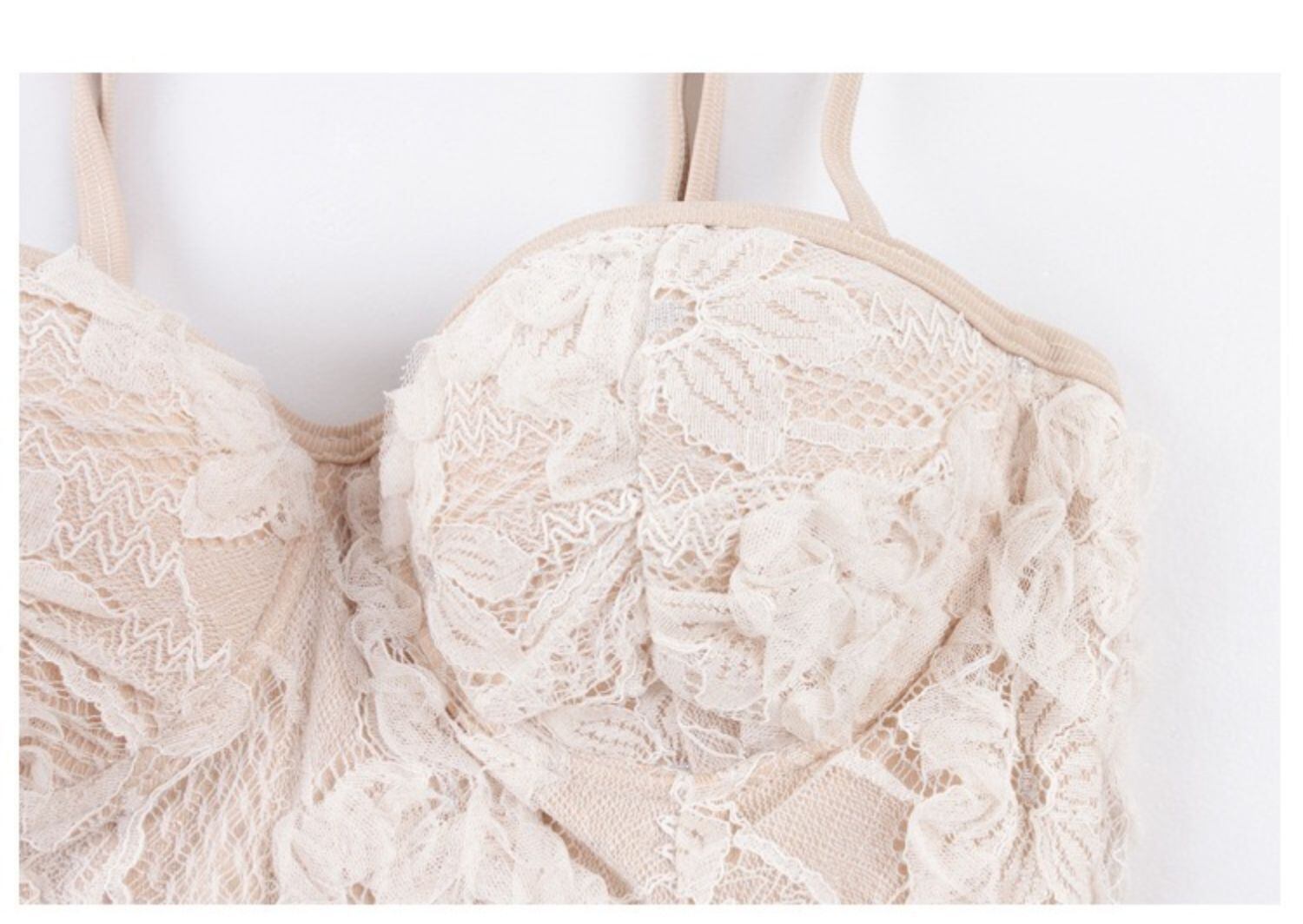 胸元をセクシーに魅せてくれる三角ワンピース。ギャザーと背中のレースアップサポートでスタイルアップを目指せます。二の腕をカバーする袖がポイントです。
